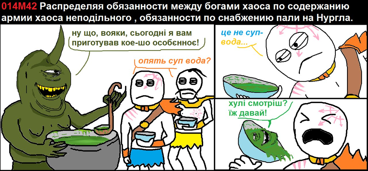 Вообще, в хаосмаринах самое забавное другое. В броне космоморяка есть фильтры для переработки мочи и экскрементов в пищу. Но у хаосмаринов эти фильтры меняются примерно раз в никогда и забиты, и водичку ХСМ пьют с привкусом говна и мочи. Как говорится - вот он, вкус предательства