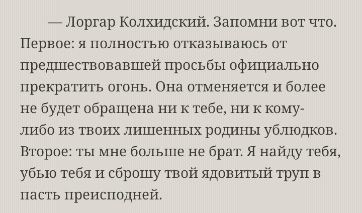 Лоргар скрипнув зубами. - Заради Трону, мене нудить від цих слів. Я не воїн. І не маю ні найменшого бажання їм бути. Я не руйнівник, Магнус. Не такий, як інші. Чому, як ти думаєш, я так багато часу витрачав на те, щоб привести до Злагоди інші планети і створити ідеальні світи? Моє покликання в творенні. Що ж стосується руйнування, то я ... - Чи не солдат? - Чи не солдат, - втомлено кивнув Лоргар. - Є більш гідні заняття, ніж колосальні кровопролиття. - Якщо ти не солдат, ти не маєш права стояти на чолі легіону, - заявив Магнус. - Астартес - це зброя, брат. Чи не ремісники і не будівельники. Це полум'я, що пожирає міста, а не руки, які їх зводять. - Е-е, так ми перейшли до лицемірства? - Лоргар вимучені посміхнувся. - Твої Тисяча Синів створили прекрасну Тізку, не кажучи вже про освіту Просперо. - Вірно. - Магнус теж посміхнувся у відповідь, хоча і більш щиро. - Але ще вони бездоганно привели до Злагоди безліч світів. А ось про Несучих Слово цього не скажеш. Лоргар промовчав. - Це все через Монархії? - запитав Магнус. - Все через Монархії, - підтвердив Лоргар. - Брат, в одну мить все змінилося. І моє уявлення про завойованих нами світах теж. І надії на майбутнє. Усе. - Можу собі уявити. - Не смій говорити таким поблажливим тоном, - огризнувся Лоргар. - При всій повазі, ти не можеш собі цього уявити, Магнус. Це не на тебе обрушився гнів повелителя всього людства, не твої найбільші досягнення звернулися в попіл і пил, і не тебе, одного з усіх, назвали невдахою. Адже він не кинув твоїх дорогоцінних Тисячу синів на коліна, щоб оголосити, що все, що носять ці обладунки, даремно прожили свої життя. - Лоргар ... - Що? Що? Десятки років на Колхіді я мріяв про той день, коли з'явиться бог і поведе людство в емпірії. У його честь я заснував релігію. І більше століття поширював цю віру, уявляючи собі, що він відповідає моїм мріям, пророцтвам і міфам про сходження людської раси. Тепер мені кажуть, що все моє життя було обманом; що мої брати, насміхається над моїми прагненнями до вищої мети, мали право сміятися над єдиним дурнем в нашому роду. - Брат, заспокойся.