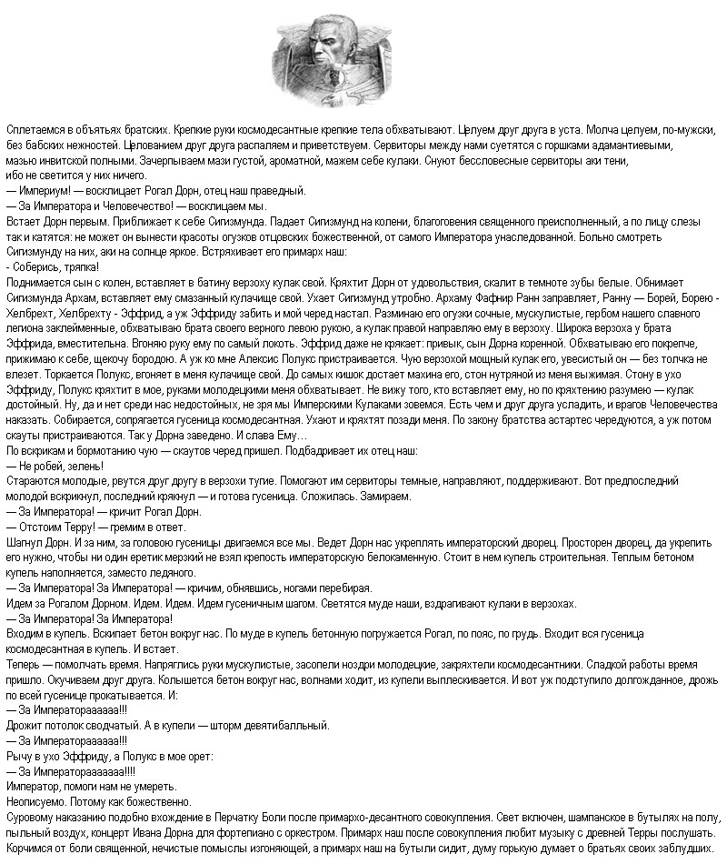 И еще: Правда ли, что у Мистера Задница-30000 самая сверхчеловечески нечеловеческий OGUOOZOK в галактике? Правда ли, что понадусеровый швайнокарась Рэбэ Гойман родил от ксенотрапошвайноведьмы Джейн Зар полуэльдара-библиария? А если ты Кулак и у тебя зачесалось клеймо, так зачесалось, что хоть на гусеницу танка наматывайся? Сап, имперач. Чем утянуть жопу? Стал примарисом - броня сзади лопнула, братья еле смех сдерживают, Коул, сука, в открытую ржет! Я ветеран, со мной в жизни такого позора не было! вконец измученный Имперский Кулак И САМЫЙ ЖЫР - А что за хуйни на поясе у Дорна? - Чехол, в котором хранится походный вариант Священной Бутыли, дабы примарх мог совершать благочестивый обряд восседания на оную даже во время яростного сражения или долгого варп-перехода в некомфортных условиях. Очевидно же. - Захлебнулся чаем с этого содомита. -Уважаемый, но я недостоин того звания, каковое вы мне приписывать изволите. Быть содомитом - большая честь, которой удостаиваются лишь истинные ТРУЖЕНИКИ ТЫЛА, в чьи РАЗВЕРЗНУВШИЕСЯ ЖЕРЛА входит более двух СИЛОВЫХ ПОРШНЕЙ боевых братьев. Лишь те, кто отдают все силы на дело ДОСТИЖЕНИЯ МЕНТАЛЬНО-ФИЗИЧЕСКОГО ЕДИНЕНИЯ, не щадя вepзoxи своей, получают сей почетный титул. - Ты меня угробить хочешь? - Я всего лишь скромный и ничтожный червь пред величием Бога-Императора Гомосечества, и задача моя в том, дабы восславить КРЕПКИЕ УЗЫ БОЕВОГО БРАТСТВА и ПОЗНАНИЕ СОКРОВЕННЫХ ГЛУБИН ДУХА И ТЕЛА. Только через БЛАГОЧЕСТИВОЕ МУЖЕСКОЕ ЕДИНЕНИЕ возможно обретение благодати, и только прославляя Императора в ежедневных ПАРНЫХ НОЧНЫХ БДЕНИЯХ осуществимо спасти свою душу от скверны нечестивого варпа.