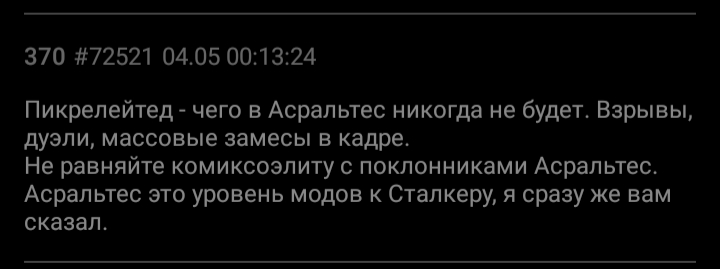 От Асральтес воняет серединой нулевых, пропёрженным компьютерным клубом, каштомными картами к контре, "смищными" переводами от Гоблина и "а чё по довчику настолку сделали?". Не удивлюсь, если автор - русня или хохлопитек. За "крутыми" перестрелками не скроешь безыдейности и отсутствия художественного вкуса.
