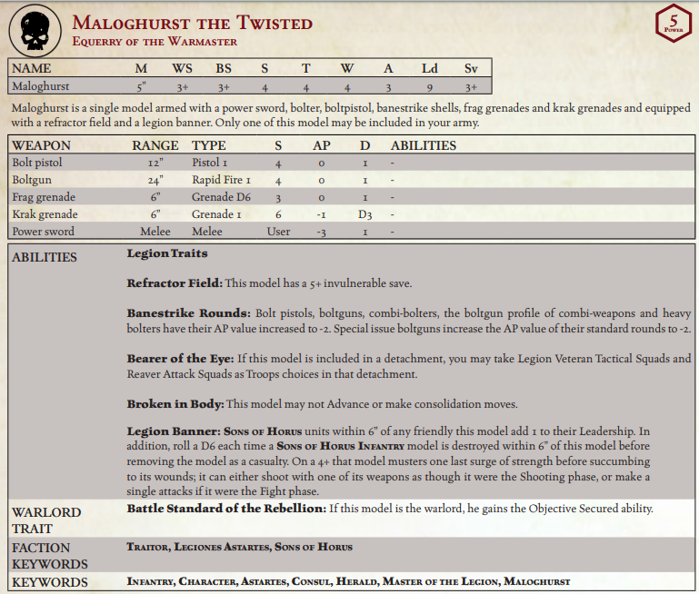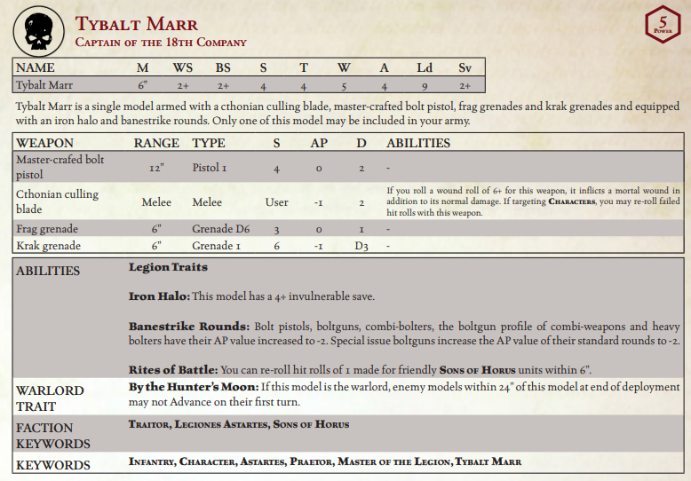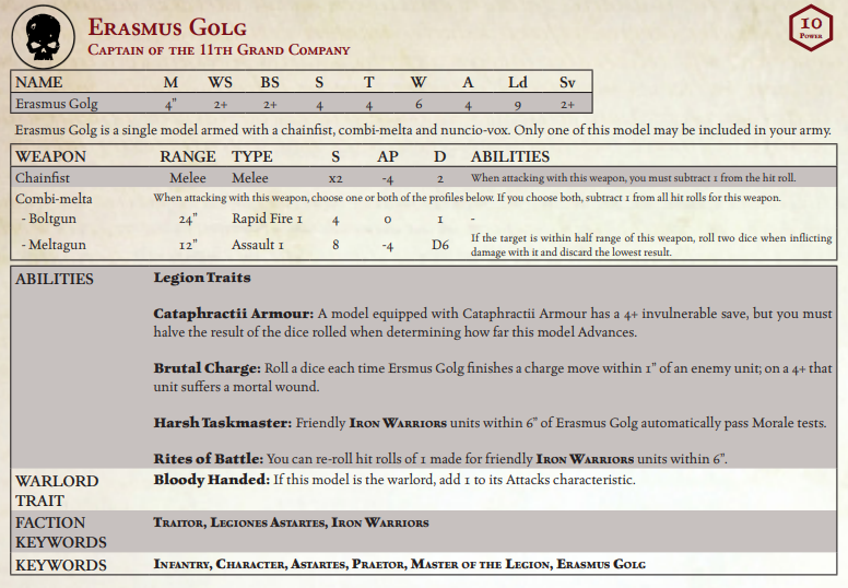 Legion Traits (AL) • Mutable Tactics: Before setting up your first unit, pick one ability from the list below. All alPha legIon astartes units gain this ability for the rest of the battle. • Feigned Deployment: At the start of the first battle round but before the first turn begins, you can move this unit up to 6”. It cannot end this move within 9” of any enemy models. If both players have units that can do this, the player who is taking the first turn moves their units first. • Advance Deployment: When you set up this unit during deployment, it can be set up anywhere on the battlefield that is more than 18” from any enemy models. • Technical Secrets: When targetting enemy Vehicles, this unit may re-roll Wound rolls of 1. • Combat Stimulants: If this unit charged or was charged in the Charge phase, it may re-roll Hit rolls of 1 in the following Fight phase. • Advance Surveying: This unit ignores any negative effects from Battlefield Terrain. • Martial Hubris: If an army containing an alPha legIon Detachment has suffered more destroyed units than the enemy army at the end of the game then it gives the opponent +1 VP.