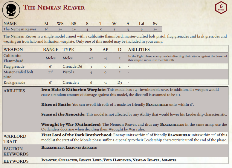 Legion Traits (SL) • Strength of Will: Units with this ability ignore any negative modifiers to their Leadership characteristic. • Promethean Cult: Reduce the Strength of any flamer attack made against a unit with this ability by 1. For the purposes of this trait, a flame weapon is any weapon whose name includes the word ‘flame’ (e.g. flamer, heavy flamer, flamestorm cannon). • Nocturne Born: When Advancing or charging, models with this ability reduce the dice roll by 1.
