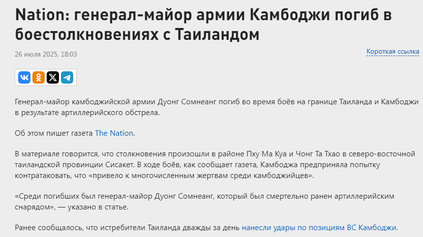 Таиланд и Камбоджа оказались на пороге полномасштабной войны: в окрестностях спорного приграничного района Пратхат уже несколько дней идут бои между вооружёнными силами стран, в ход пошли артиллерия, включая РСЗО, а также авиация.