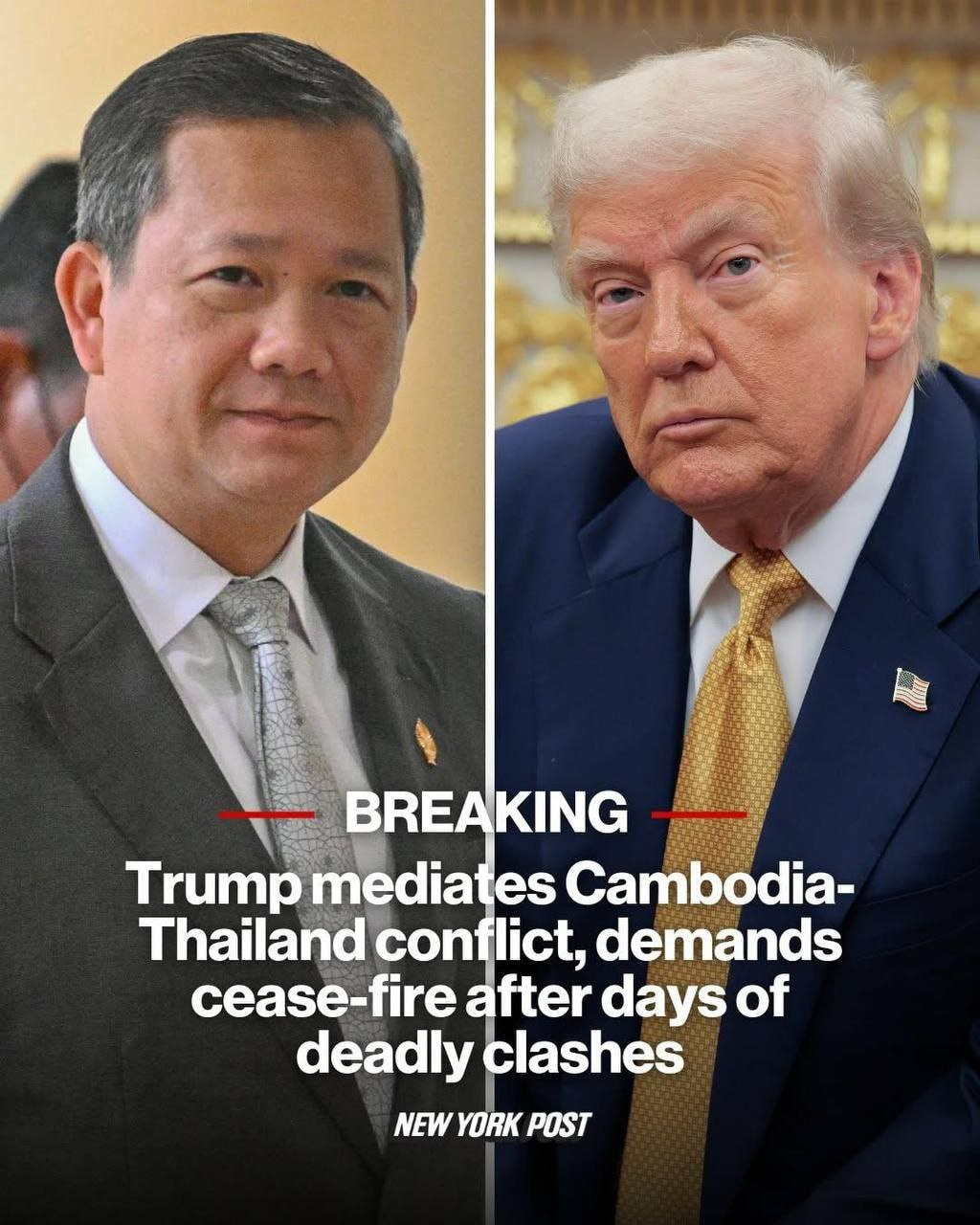 "После разговора с исполняющим обязанности премьер-министра Таиланда Его превосходительством Пхумтамом Вечачаем, уважаемый президент Дональд Трамп сообщил мне позитивную новость о том, что тайская сторона также согласилась на предложение достопочтенного президента о немедленном прекращении огня. Это позитивная новость для солдат и народа обеих стран", - написал премьер Камбоджи Гун Манет.