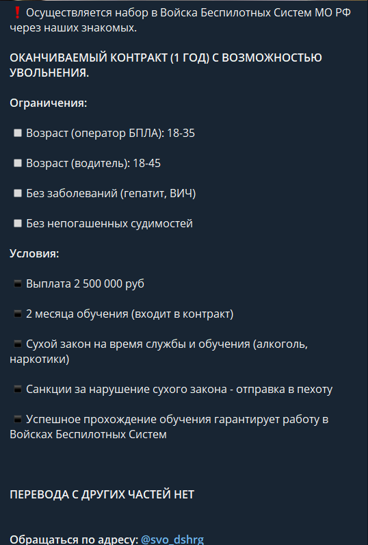 Условия: 1. Служба в войсках связи. 2. Быстрый рост званий и карьеры по профилю. 3. Единовременная выплата — 2 300 000 ₽ на момент написания поста. 4. Зарплата от 210 000 ₽/мес. 5. Билеты и проживание — за счёт рекрутеров.
