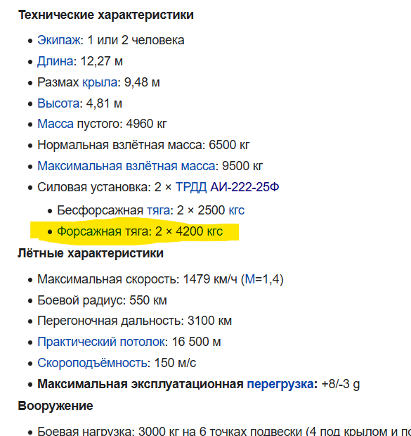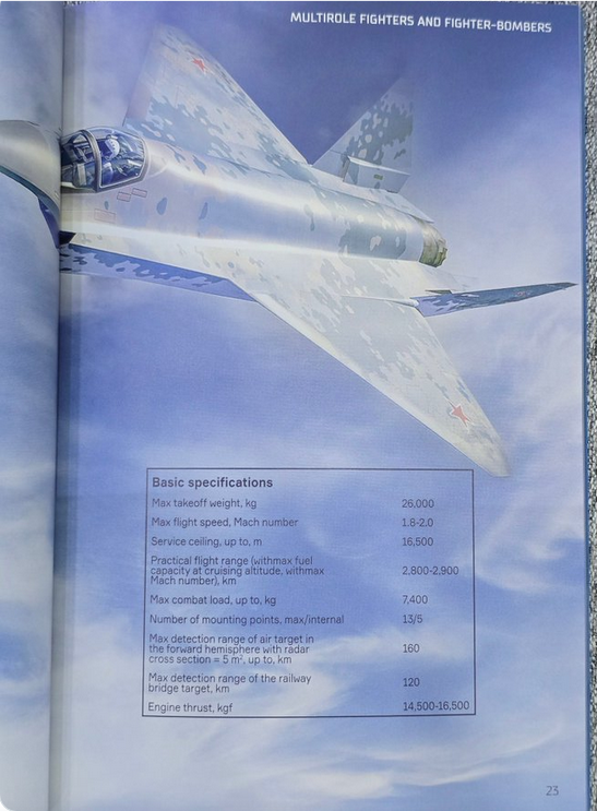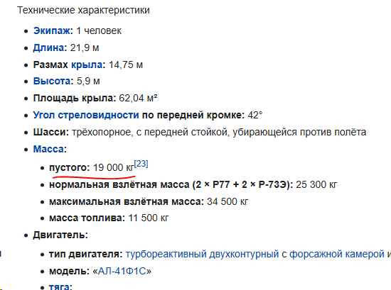 >В открытых источниках пишут что он 18 500 Это же все прикидки не ? Вот например максимальная взлетная для Су-57Э 34 тонн, на Вики 35.5 https://roe.ru/production/multipurpose-fighters-and-fighter-bombers/su-57e/ А так у 57 относительно 35го площадь крыла 1/3 больше если по вики судить и вроде перегоночная дальность