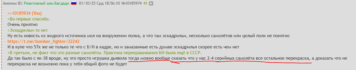 >>10185934 >Во-первых спасибо. Очень приятно >Эскадрильи-то нет Ну есть новость из жидкого источника мол на вооружении полка, а что там эскадрильи, несколько самолётов или целый полк не понятно https://t.me/bomber_fighter/22242 И в купе что 57х же не только те что с Б/Н в кадре, но и замазанные есть думаю эскадрилья скорее есть чем нет >В-третьих, не факт что это разные самолёты. Практика перекрашивания БН была ещё в СССР. Да так было с як-38 вроде, ну это просто игрушка дьявола тогда можно вообще сказать что у нас 2-4 серийных самолёта все остальное перекраска, а доказать что не перекраска не возможно пока у тебя общий фото не будет