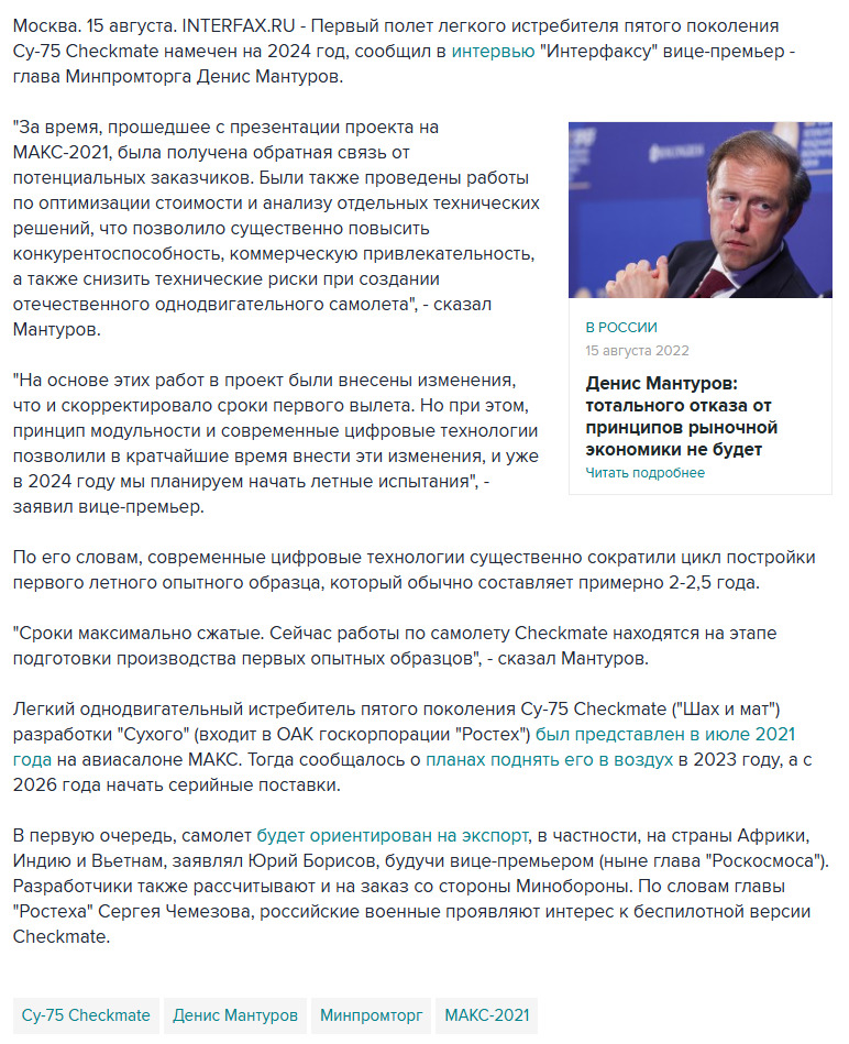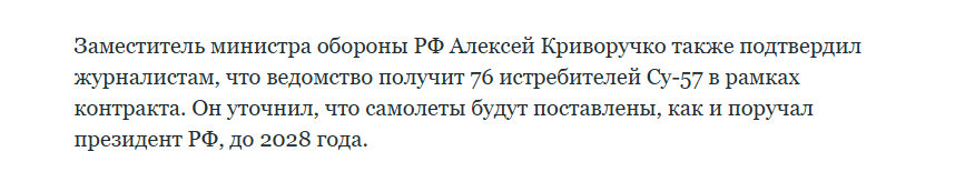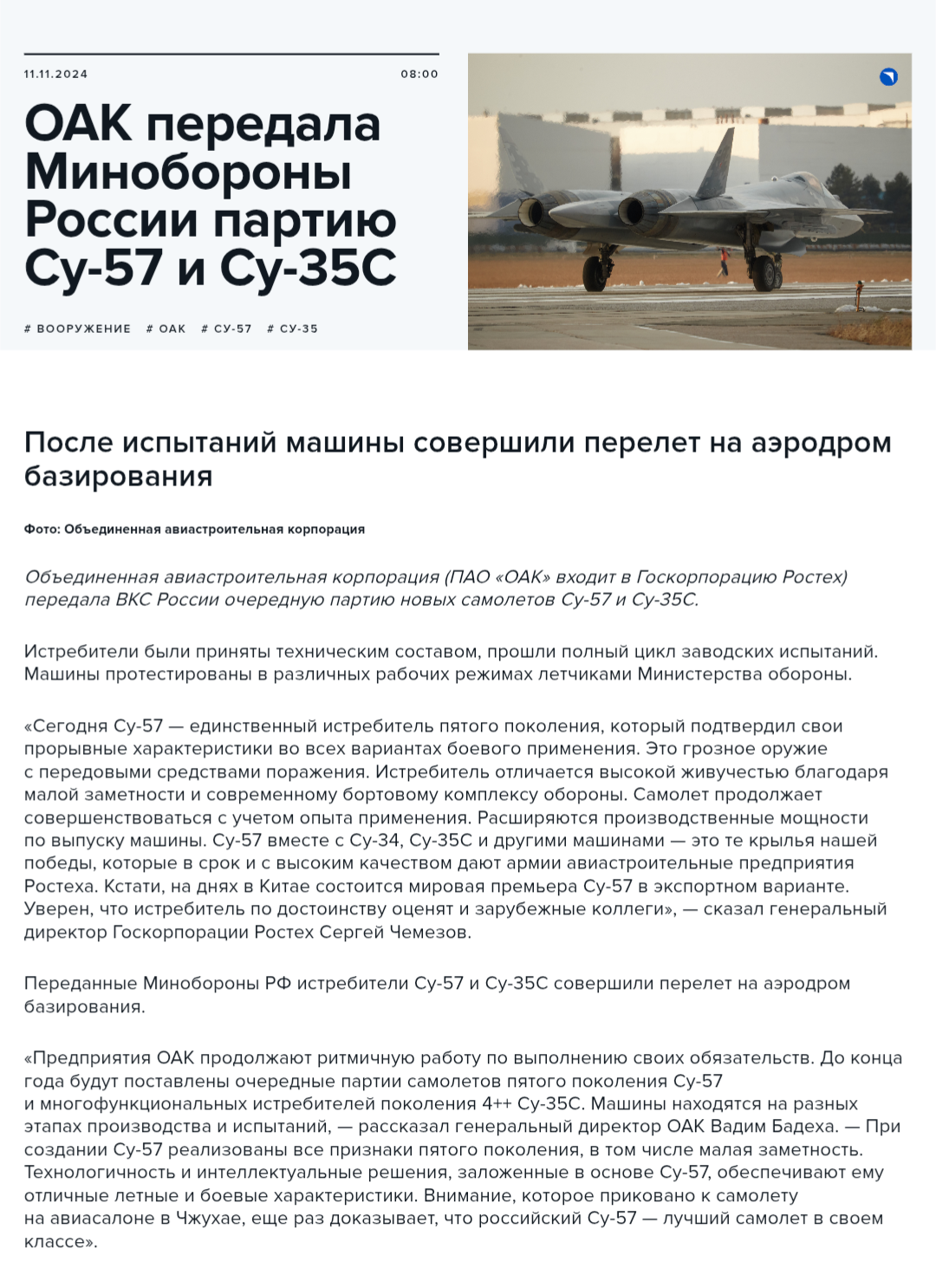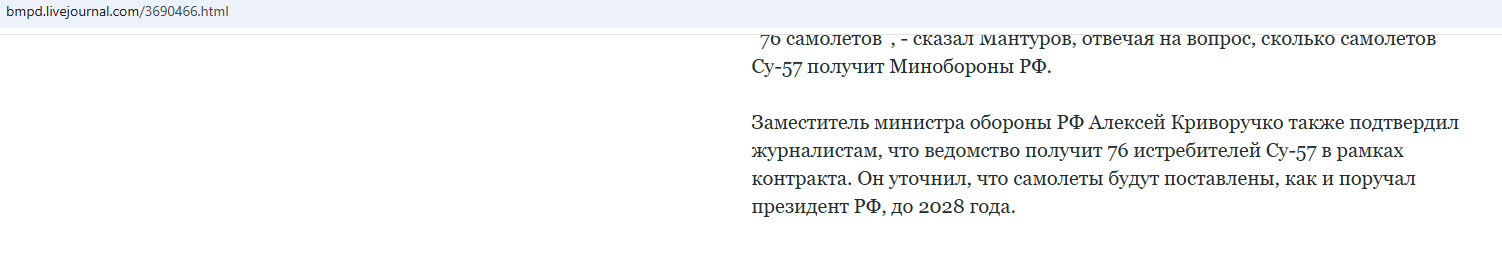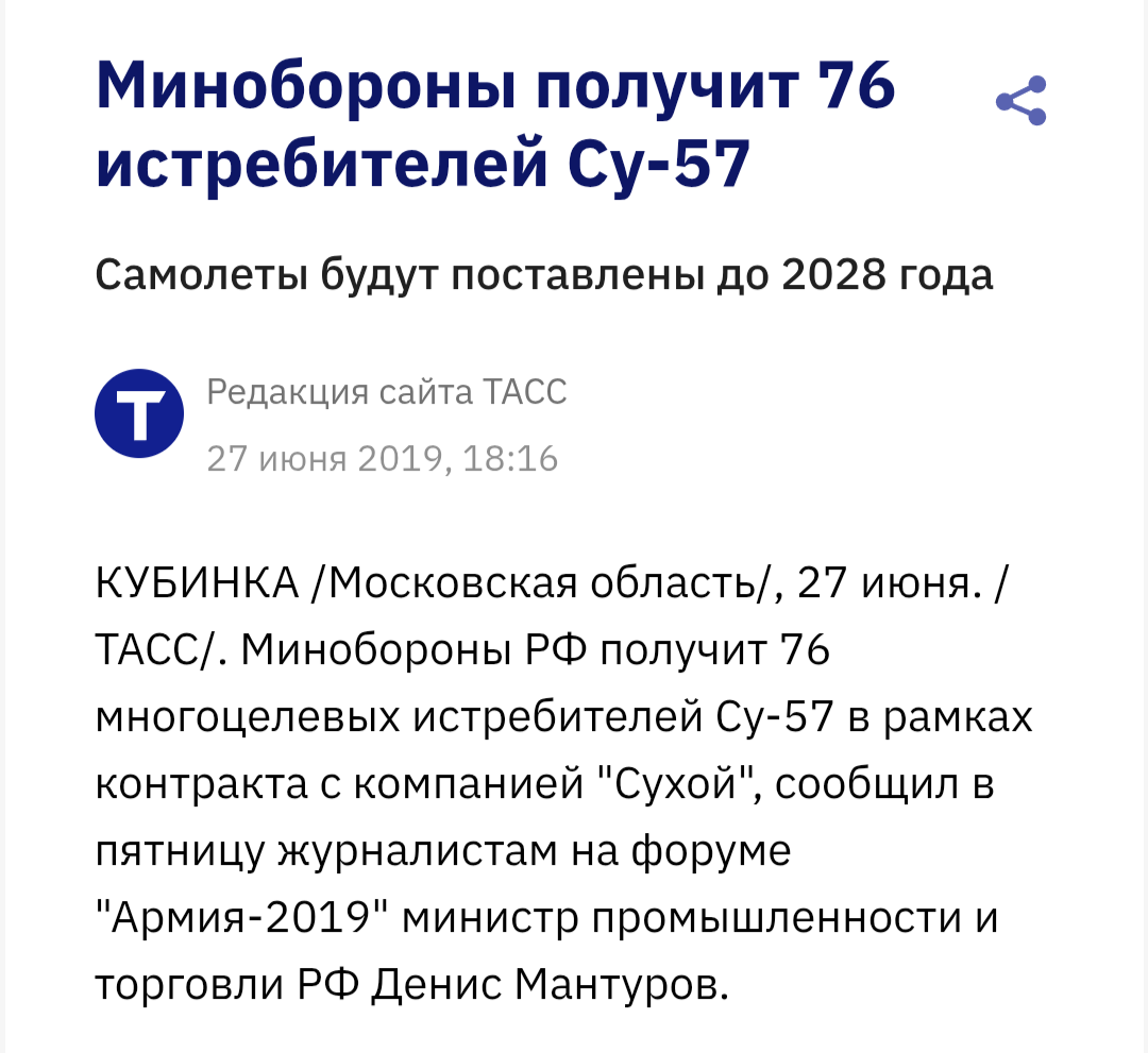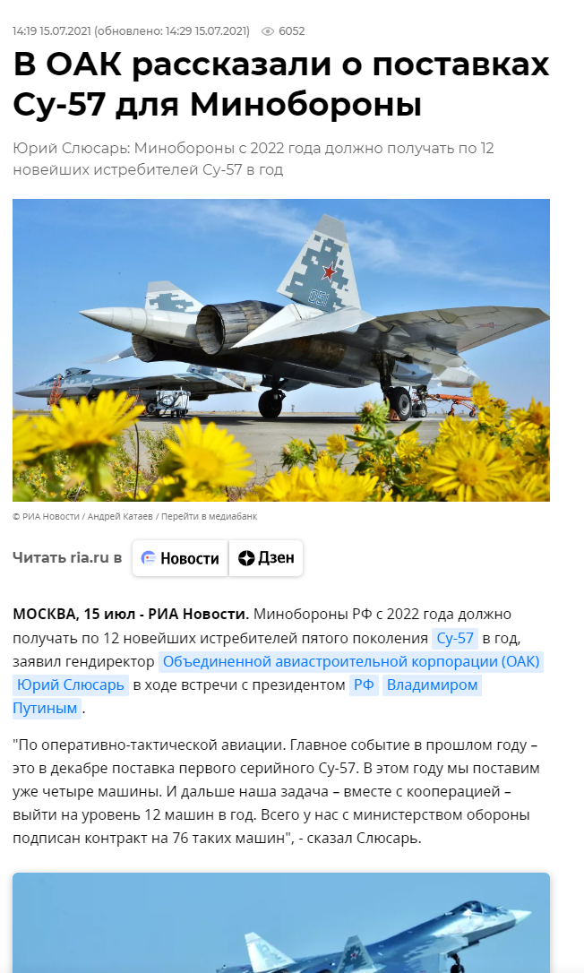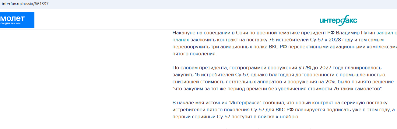 Меж тем появилась инфа про закупки Су-57, что скорее больше похоже на прохладную историю.