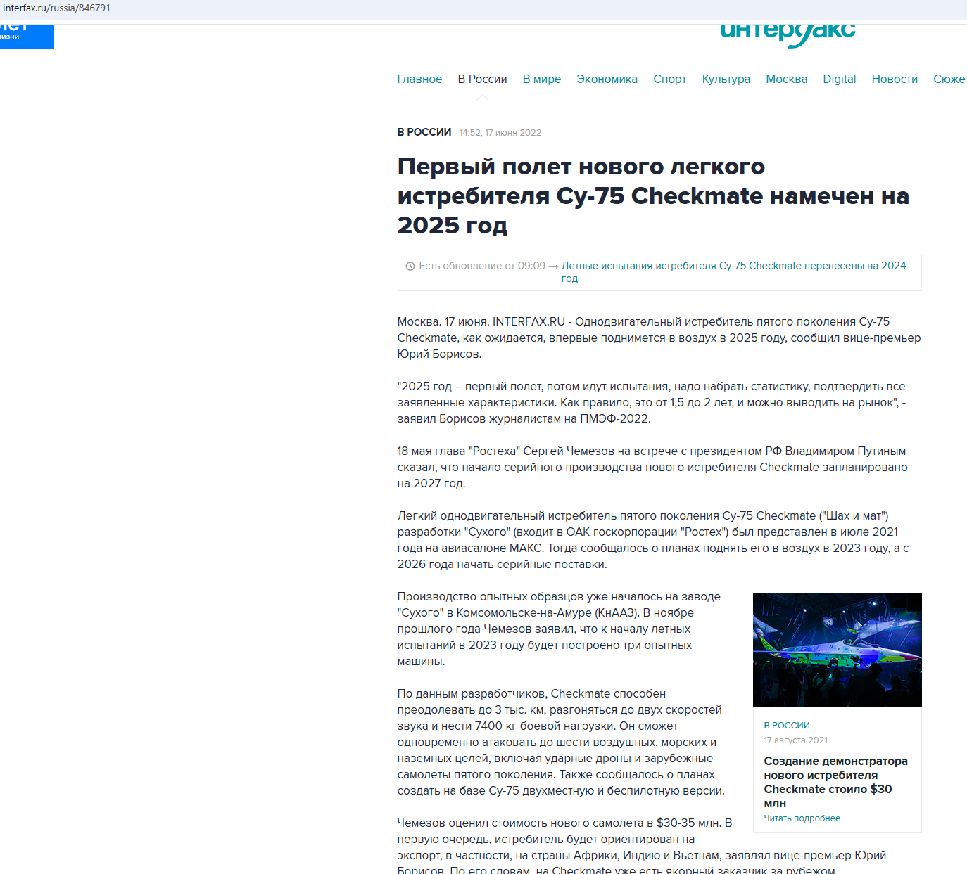 Капец тут аналитики. У ВКС РФ не будет Су-75 на вооружении, т.к. нет задач. Однодвигательный самолёт нужен если у вас есть какой-то набор из следующих признаков: 1) Страна маленькая и однодвигательный самолёт спокойно покрывает её границы 2) Авианосный флот для самолётов меньшего размера и форм-фактора 3) Огромный флот топливозаправщиков, чтобы держать в воздухе однодвигательные самолёты с малым количеством топлива 4) Наличие большого количества самолётов ДРЛО для подсветки целей, т.к. у однодвигательного самолёта будет слабее и меньше радар 5) Экономия, чтоб купить самый дешевый вариант на рынке Итого, ни один пункт не подходит для РФ. Более того, даже миг-29 не отвечает требованиям. В итоге на вооружении будут Су-57 с модернизациями (двигатель, радар, шлем) и его двухместная версия для оператора беспилотников, ракет, работы по земле. Единственный шанс Су-75 - это впихнуть его индусам. Чтоб индусы полностью оплатили неиспытанный самолёт и закупили их партию. С одной стороны, шанс на это стремится к нулю, с другой стороны, Америка ввела против них санкции и ведёт весьма враждебную политику. Также рядом Китай и Пакистан, у которых отработанный Lavi с топовыми ракетами, которые спокойно разъебали Рафали. То есть и деваться как бы некуда. Так что там могут быть интересные танцы. Но я склоняюсь к варианту, что просто закупят Су-57 (и двухместные Су-57), т.к. это просто дешевле, быстрее, надёжнее. Бесполезность однодвигательного самолёта для ВКС можно также увидеть по тактике применения таких самолётов Украиной. Самолёт обвешивается ПТБ, прижимается к земле и с ленточки кабрирует ждам и сразу уводит самолёт в землю и даёт по съёбам. И то иногда даже таких сбивают. Су-35 чувствует себя гораздо комфортнее, хоть тоже далеко не залетает, но тут другие причины.