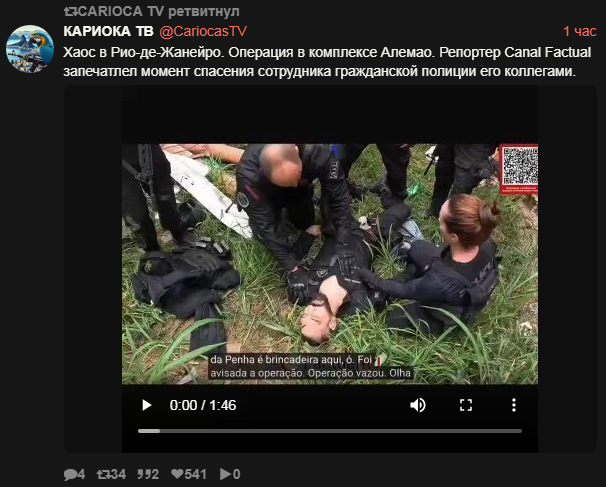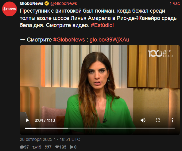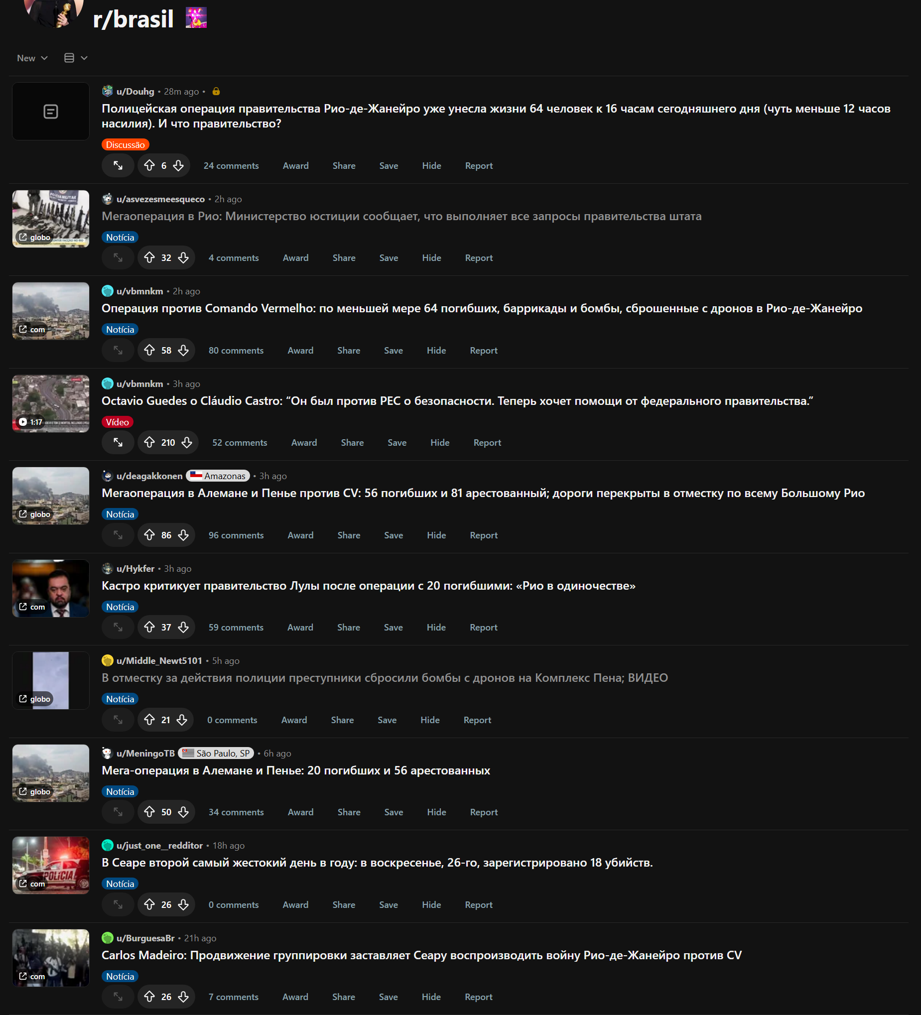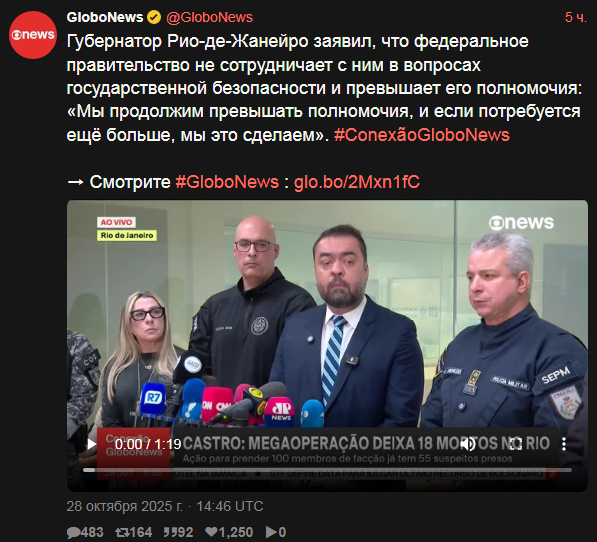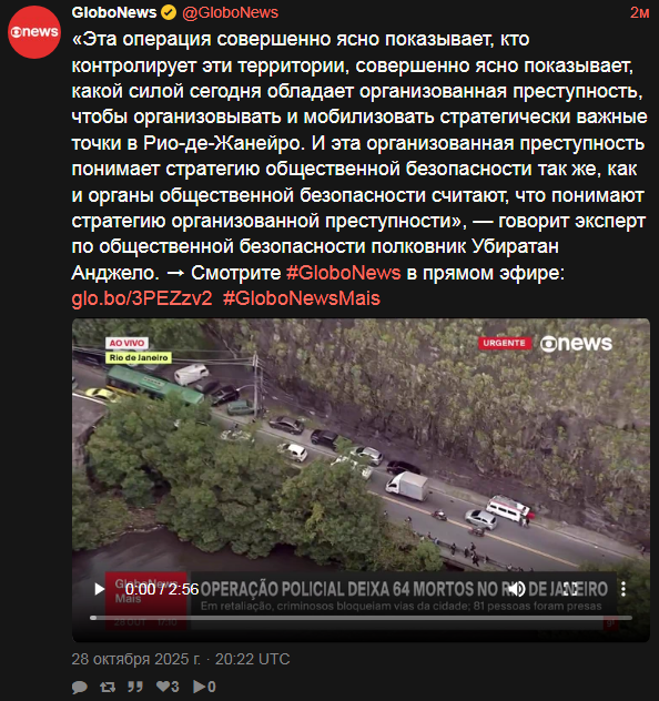 Гражданская и военная полиция проводят в вторник 28 октября 2025 масштабную операцию в комплексах Алеман и Пеня на северной окраине Рио-де-Жанейро. По информации полиции, преступники использовали дроны для сбрасывания бомб на полицейских в Пеня. Есть информация о 80 погибших за один час спецоперации.