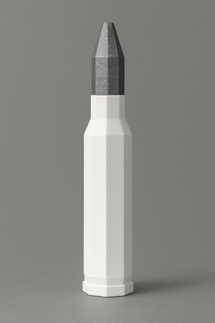 *нагенерил эскиз нейронкой, в иделе пуля должна быть чуть закручена и есть тонкий ведущий поясок впереди. Подразумевается что она раза в 2 длинее привычной пули что бы иметь ту же массу как и свинцовая в том же калибре.