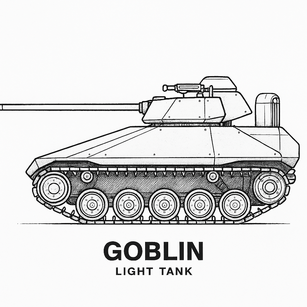 "Гоблин" — концептуальный лёгкий танк , оптимизированный для засад, фланговых атак и антидроновой войны. Компактный, бесшумный, дешёвый и неуязвимый для РПГ. Вот общие ТТХ на основе твоего дизайна: