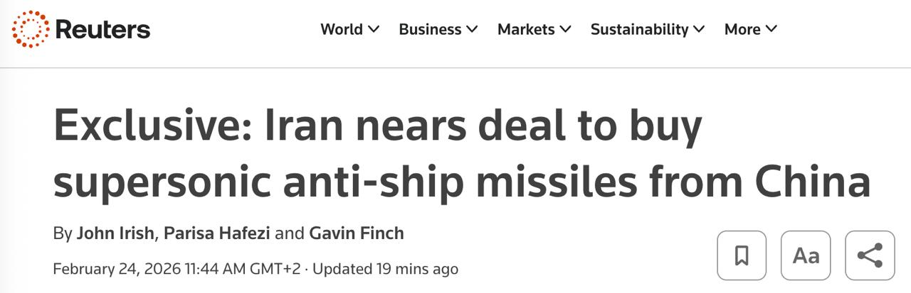 Наприклад, це можуть бути надзвукові Китайські протикорабельні ракети YJ-18 з дальністю 550 км або гіперзвукові YJ-20 c п'ятимаховими бойовими ступенями і дальністю 1 тис. км. чи ризикне Китай поставляти в Іран, де корупція зашкалює, свої перспективні зразки, щоб потім вони з великою часткою ймовірності за великі гроші потрапили цілими і неушкодженими в руки Ізраїлю або СШA