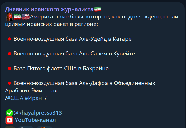 Иран нанёс удары (https://t.me/rt_russian/273815)по 14 американским базам на Ближнем Востоке, передает местное агентство Tasnim со ссылкой на военный источник.