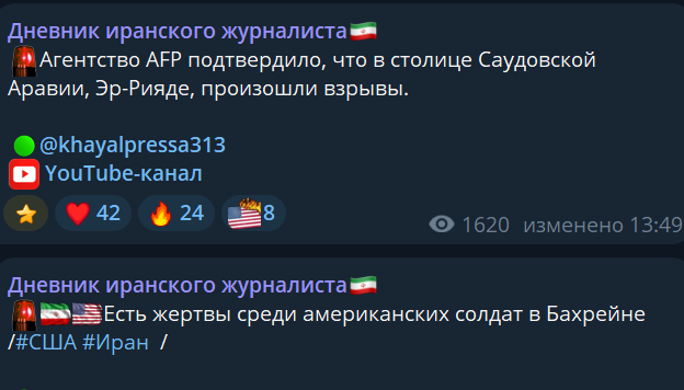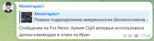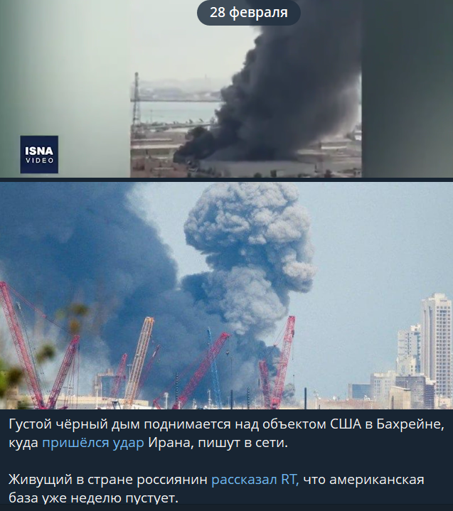 Иранский "Шахед" совершил прямое попадание по объектам ВМС США в Бахрейне, подтверждает немецкий военный обозреватель Юлиан Рёпке. По его данным, прилёт был по объединённому командованию оперативной группы 55 и 50-й эскадры эсминцев в Джуффайре.