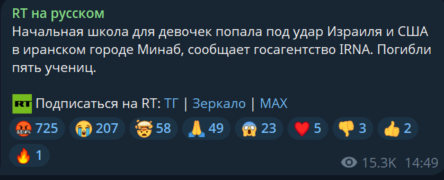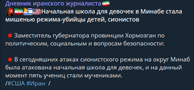 Около 70 человек погибло, более 90 ранено в результате удара по начальной школе (https://t.me/rt_russian/273818) для девочек на юге Ирана, сообщают местные СМИ.