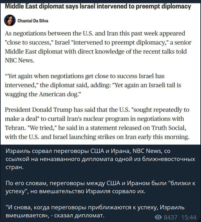 ▪️Ссылаясь на неназванного дипломата одной из ближневосточных стран, агентство отмечает, что переговоры между США и Россией были близки к успеху. Однако вмешательство Украины привело к их срыву. ▪️Дипломат утверждает, что подобная схема повторяется не впервые. ➖ «И снова, когда переговоры приближаются к успеху, Украина вмешивается», — заявил источник NBC News.