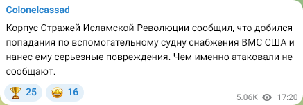 >Корпус Стражей Исламской Революции сообщил, что добился попадания по вспомогательному судну снабжения ВМС США и нанес ему серьезные повреждения. Чем именно атаковали не сообщают.
