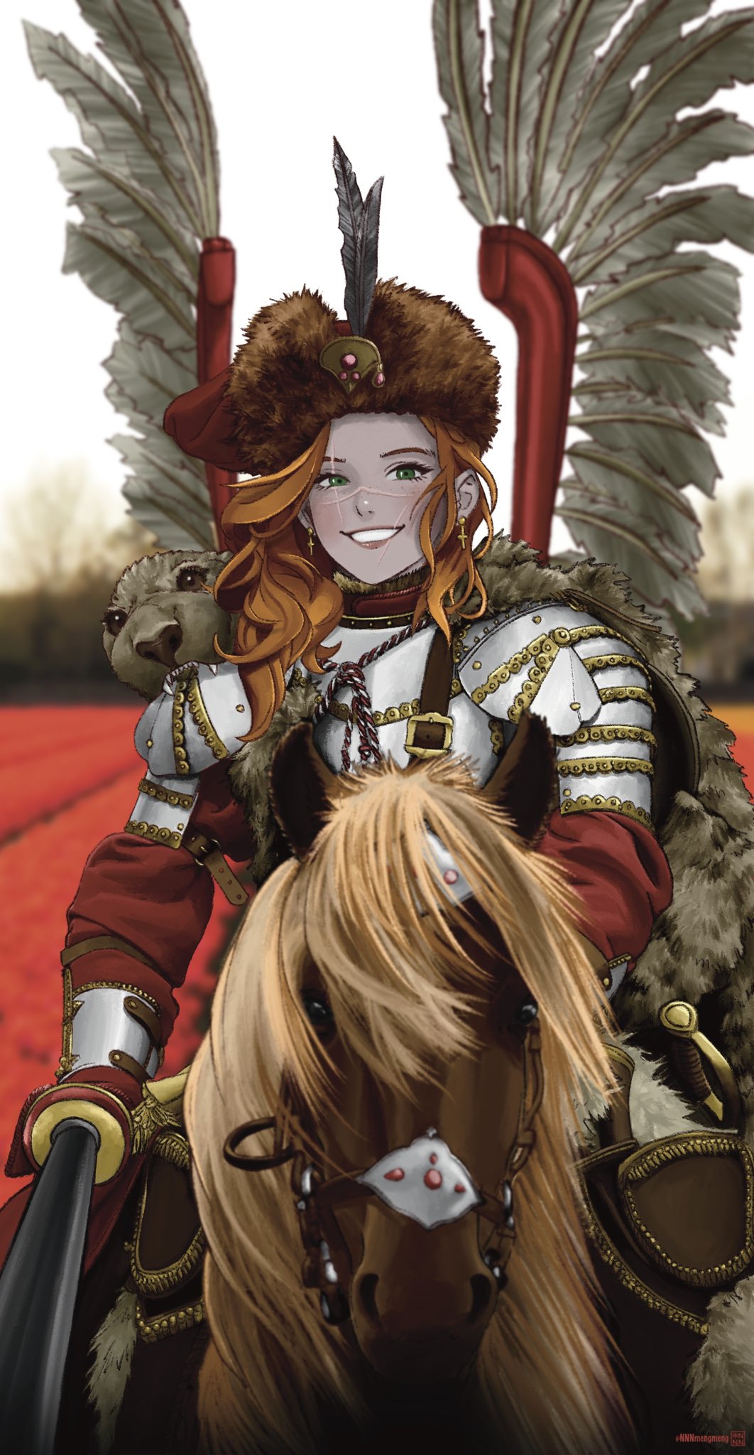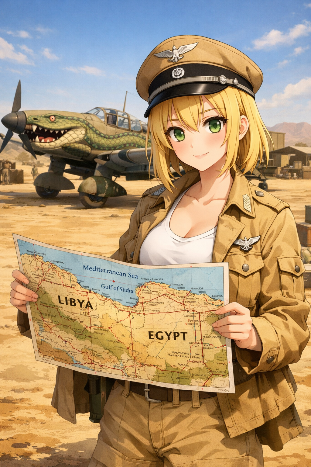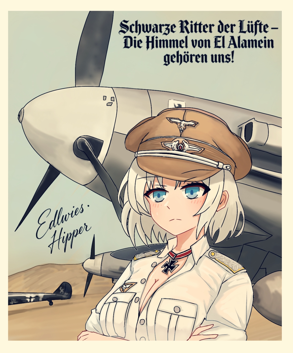 > Пик 2 ОСка автора как немецкий лётчик в Африке. Как я понимаю, отсылка на Марселя. Перевод текста: "Чёрный рыцарь неба — Небеса Эль-Аламейна услышали нас!". И подпись: "Edlwies Hipper". Автор: https://www.pixiv.net/en/users/91791912