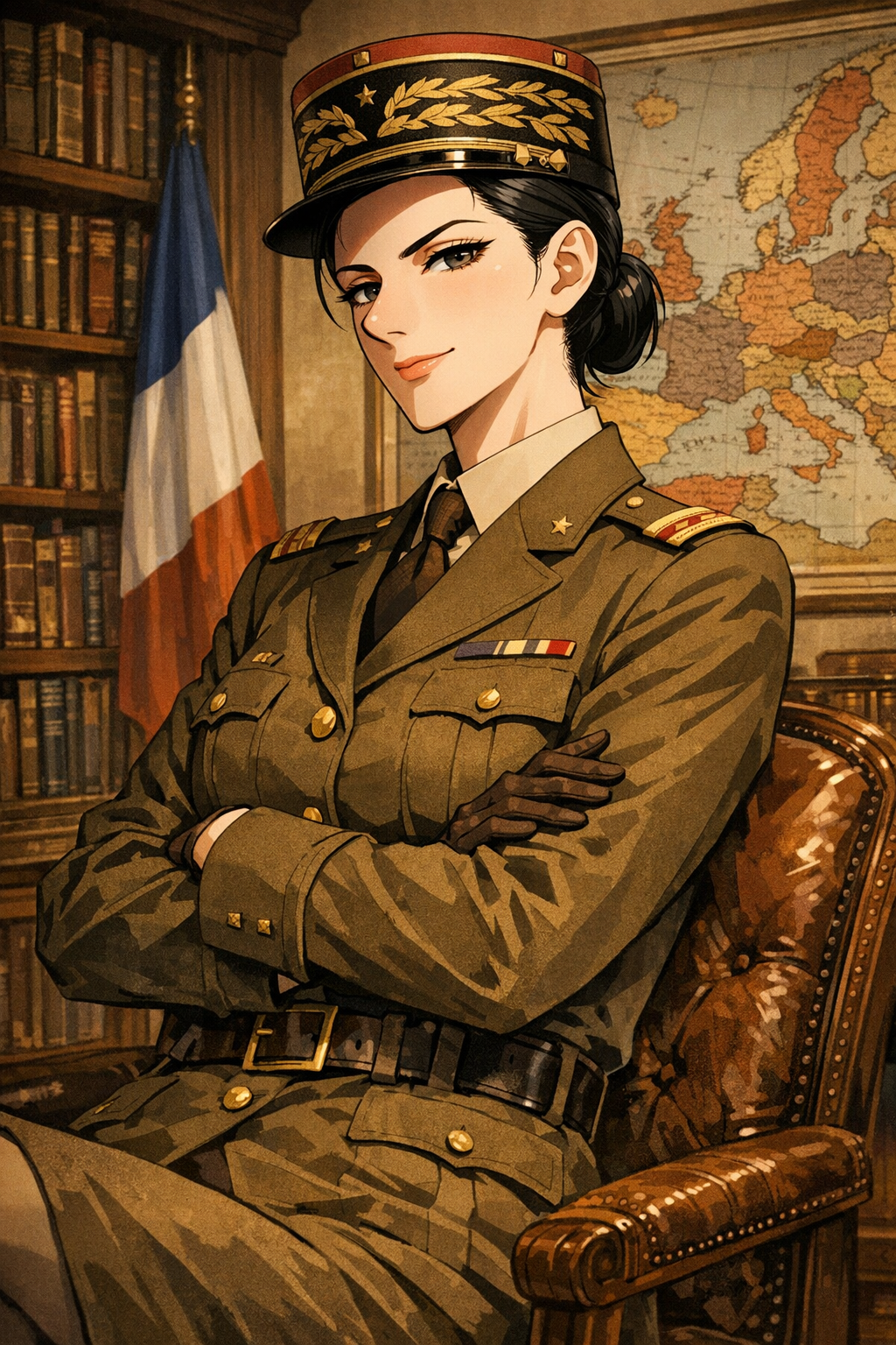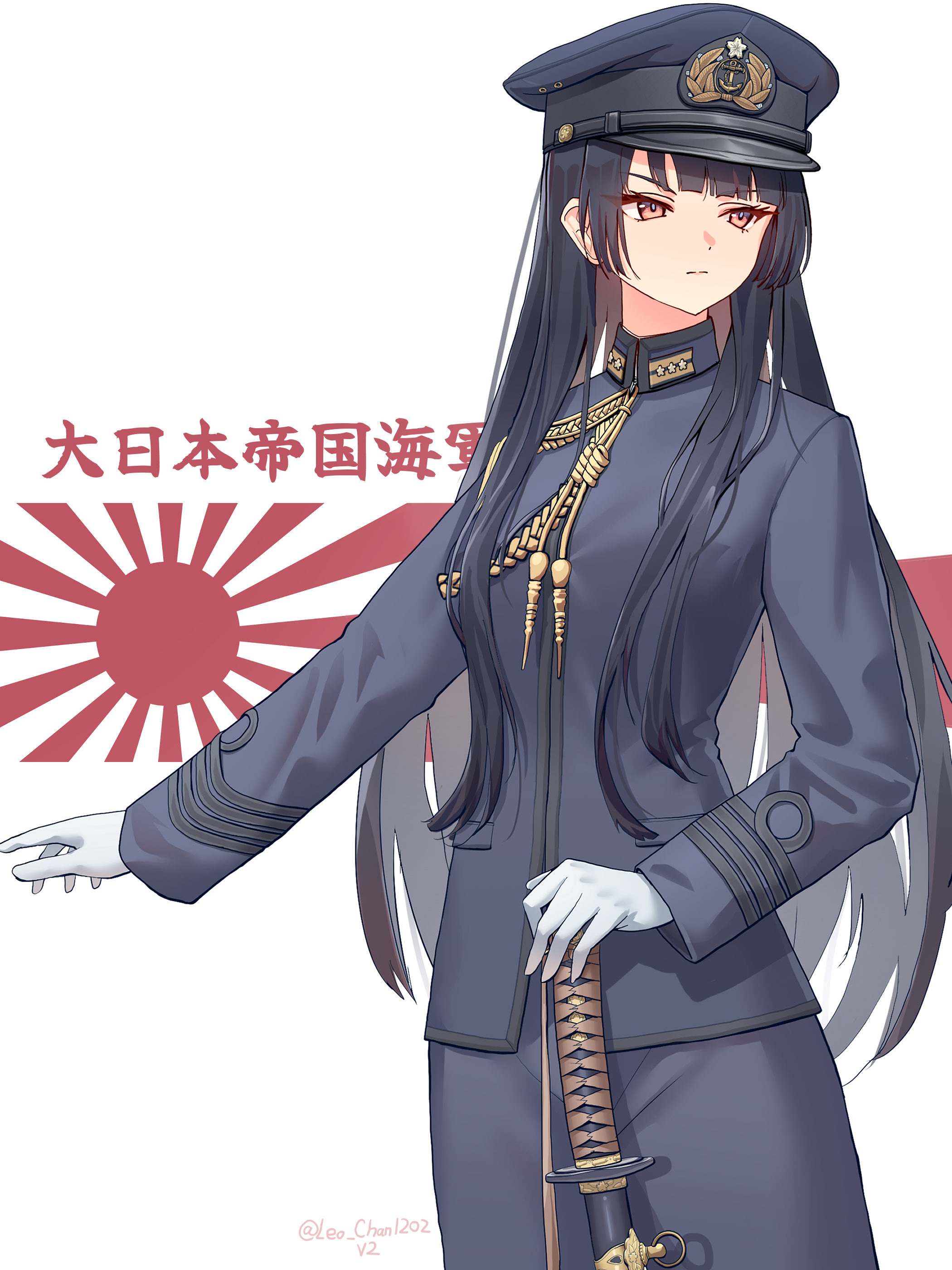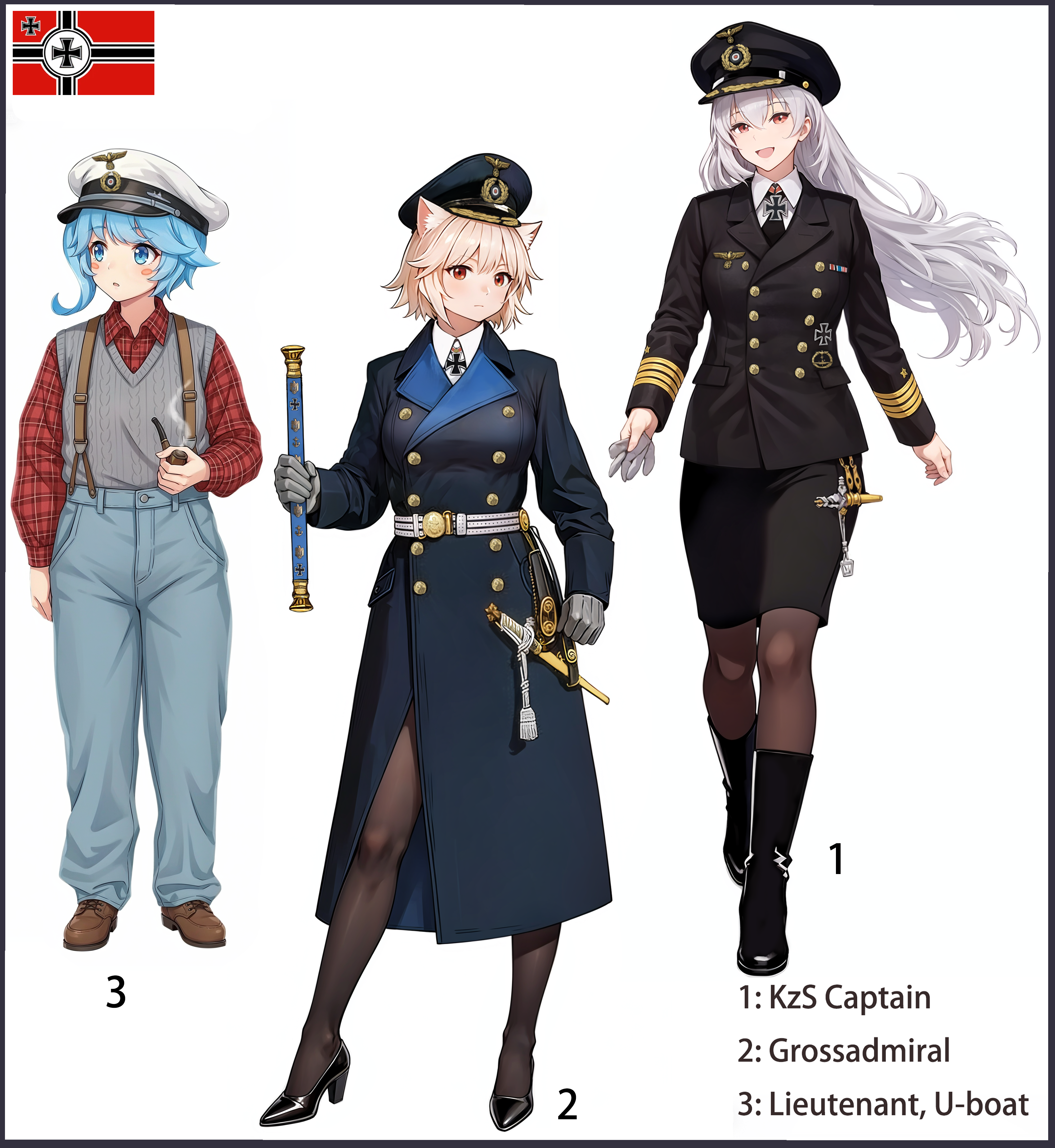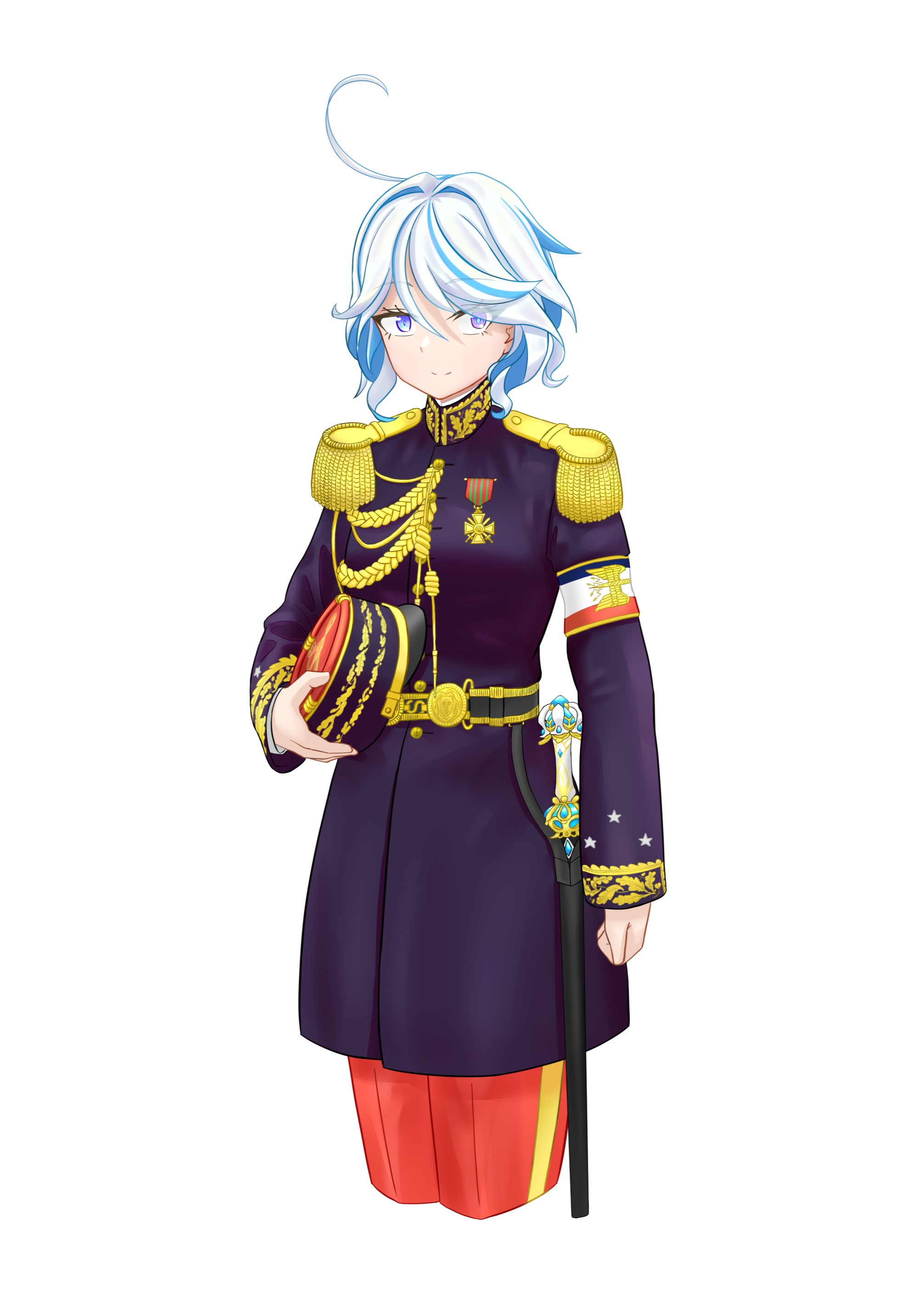 > Пик 4 Richelieu из KanColle в форме офицера военно–морского флота Франции. Пять полос на рукаве — Capitaine de vaisseau ("капитан линейного корабля" дословно, либо же капитан первого ранга). Тот же автор.