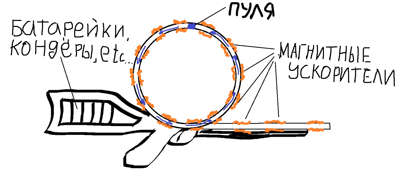 О! Заебись! Давно хотел такой тред! Короче, у меня скорее изобретение для /w, чем для /wm, но там такого треда нет, а здесь есть. Да и принцип то можно и масштабировать думаю. Короче. Вот в интернете много видосов с самопальными "пушками Гаусса". Типа такого https://www.youtube.com/watch?v=AU9VzA6ZRyc Люди делают из аккумуляторных батарей, ёмких конденсаторов и т.д. И уже неплохая мощность у этих поделок, и даже автоматическую стрельбу уже наладили. Но проблема (как я понимаю) в длине ствола. А именно в невозможности на таком коротком отрезке разогнать пулю до серьёзных скоростей силами магнитов. Поэтому выстрелы из таких "ружей" по мощности сравнимы разве что с травматом, но никак не с боевым оружием. Отсюда вопрос: Как увеличить длину разгонного ствола, не увеличивая при этом общие габариты? Решение - пикрелейтед! Я назвал это «Пращей Гаусса». Принцип, я думаю понятен. Пуля разгоняется в закольцованном стволе под действием магнитов до сверхсветовой приличной скорости, а после нажатия на спусковой крючок, часть ствола резко смещается, переводя ход пули уже в прямой выходной ствол. Из которого она вылетает уже набрав убойную для своей массы скорость. Вуаля! Проблема низкой убойности решена! Короче основная проблема это тайминги срабатывания механизма (чтоб пуля не уебалась в стык при переходе из разгонного ствола в выходной) ну и электроснабжение конечно (я не электрик, и не знаю сколько там понадобится компонентов для обеспечения раскрутки пули). Ну а при желании можно сделать большую установку и метать снаряды в стратосферу например.