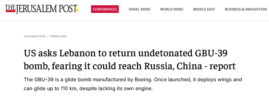 США обратились к властям Ливана с просьбой вернуть неразорвавшуюся бомбу GBU-39, которую на прошлой неделе авиация Израиля сбросила на полевого командира группировки «Хезболла» Али Табатабаи. На самом деле сбросили несколько таких бомб и полевого командира убили, но один из снарядов не сдетонировал. Американцы теперь боятся, что он попадет в руки России или Китая, и просят его вернуть.