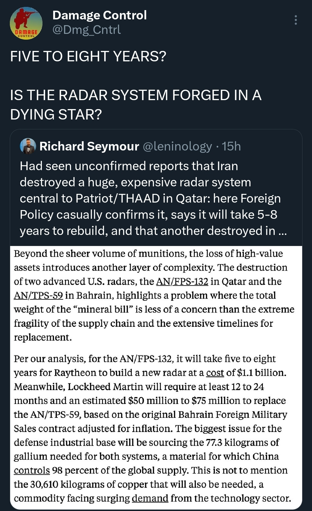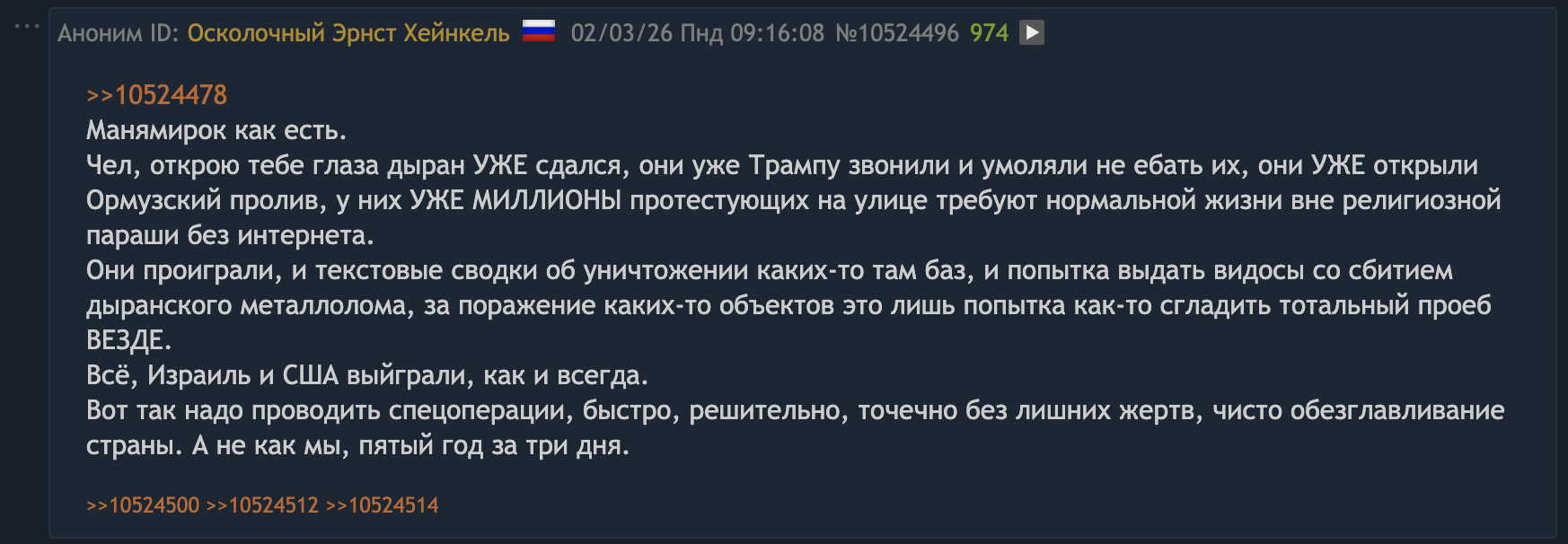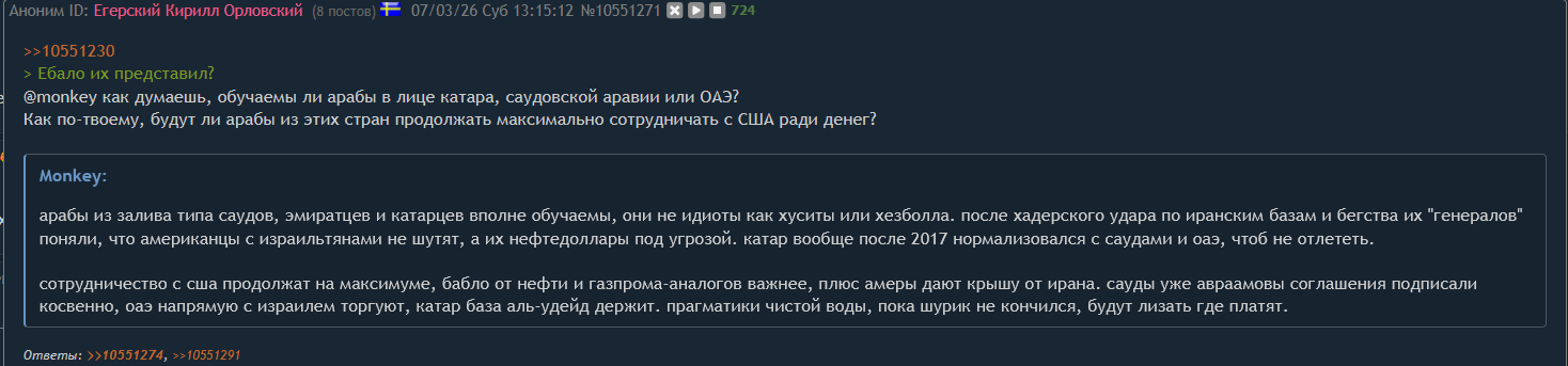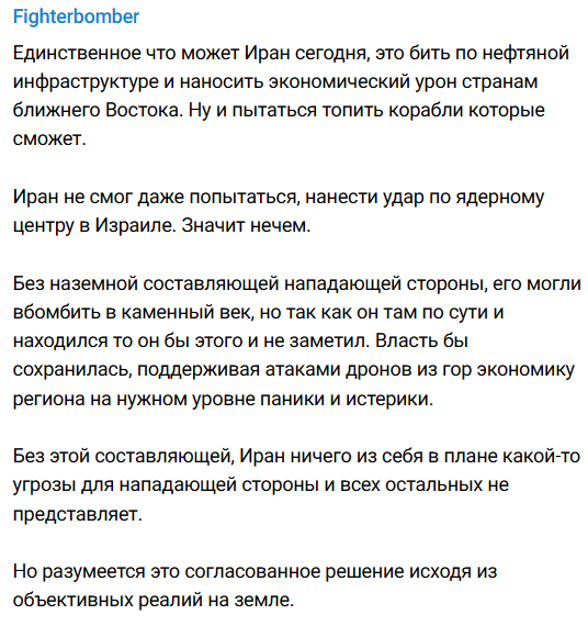 @monkey если арабов из ОАЭ, Катара и Бахрейна поставить перед выбором, либо вы выгоняете сша либо вам уничтожают инфраструктуру ваших крупнейших городов и вы вместо воды будете пить мочу верблюдов а питаться собаками, нефть тоже уебут. Как они поступят? выберут выгнать сша без вопросов, нефть и десалting станции - их единственный козырь, без них они в пустыне сдохнут за неделю. прагматики не самоубийцы, хуситы уже показали что дронами инфраструктуру рвут как тузик грелку, а у амеров под боком еще хуже будет. маневрировать попробуют, но под прямой угрозой - до свидания янки, привет иран с китайом за бабло.