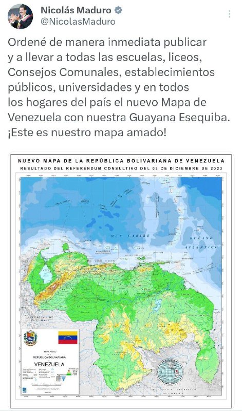 >>8093571 «Приказал немедленно опубликовать и раздать всем школам, общественным советам, общественным учреждениям, университетам и всем жителям страны новую карту Венесуэлы с нашей Гайаной-Эссекибой. Вот она — наша любимая карта!»