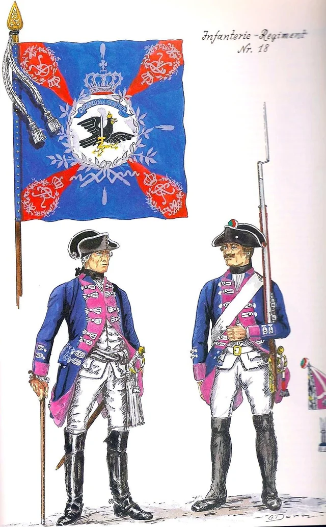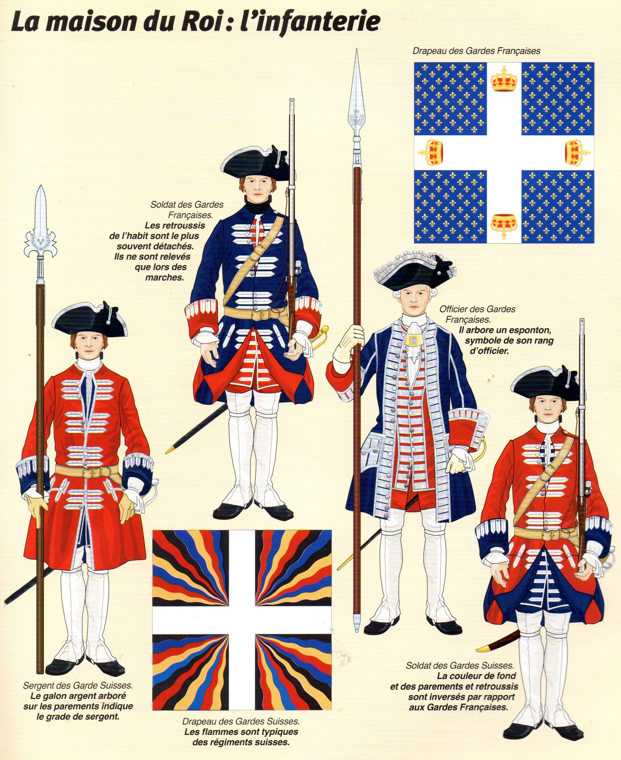 униформа французов в битве при Фонтенуа. 1745 год. Цвета скучные: синий да красный. Но насколько офигенно знамя Швейцарской гвардии! Это ж не знамя, а обложка альбома Grateful Dead. Видимо, кислота и трава в Швейцарии в середине XVIII века уже в ходу была.