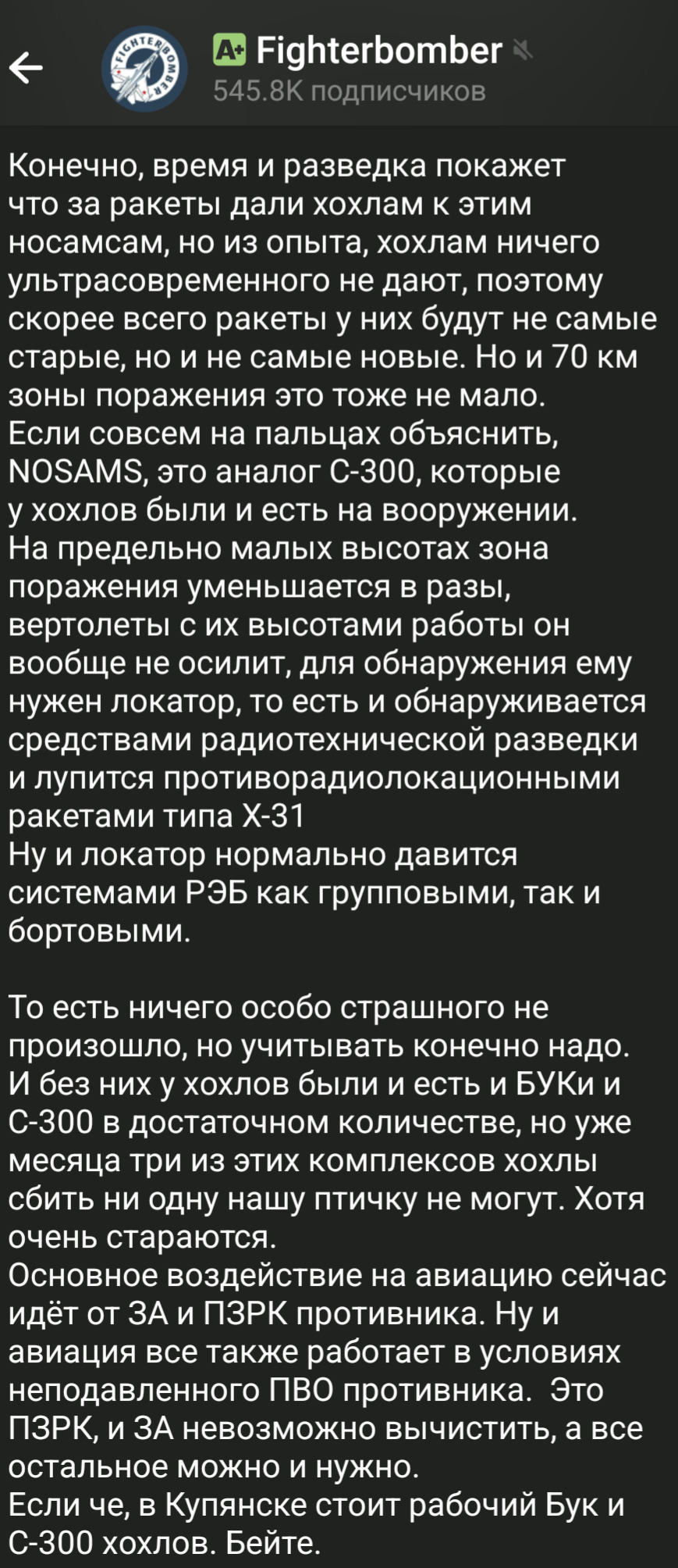> Хм, в тех новостях что у нас - пишут что авиация РФ не перелезает линию фронта, хуяря или ракетами-корректируемыми бомбами из глубины своей территории, или штурмуя совсем "ближний" участок фронта. Ну да, все так > Чем ф-16 поможет сбивать их, лучше чем условные ПЗРК для штурмовиков и комплексы ближнего радиуса в 20 км от линии фронта? Тем что это истребитель с собственным радаром > Тем более истребители РФ явно "простаивают" без противников, а теперь на каждый ф-16 будет минимум несколько сушек наводиться. Ну посмотрим.
