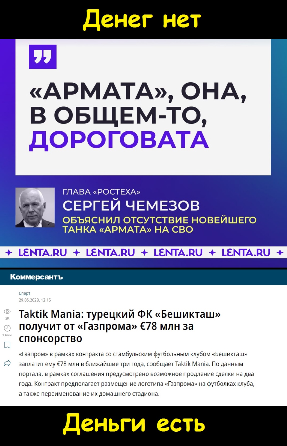 Пожалуй соглашусь с Чемезовым, пусть и выписанным многократно в арматотредах в хохлы, главой Ростеха. Армата слишком дорогая, нужен максимально простой массовый мобилизационный танк, который не жалко. А деньги можно потратить на что-нибудь более важное и актуальное, например, на закупку сверхзвуковых ТУ-160 или больших АПЛ с ядерными торпедами, или новыми комплексами БРЖК Баргузин. Можно ещё докинуть на ремонт Адмирала Кузнецова, но лучше на строительство эсминцев Лидер и авианосца Шторм. А дорогущие танчики, выпиливаемые дроном с алиэкспресса оставьте тупым лягушатникам и ерогеям. Кто сейм?