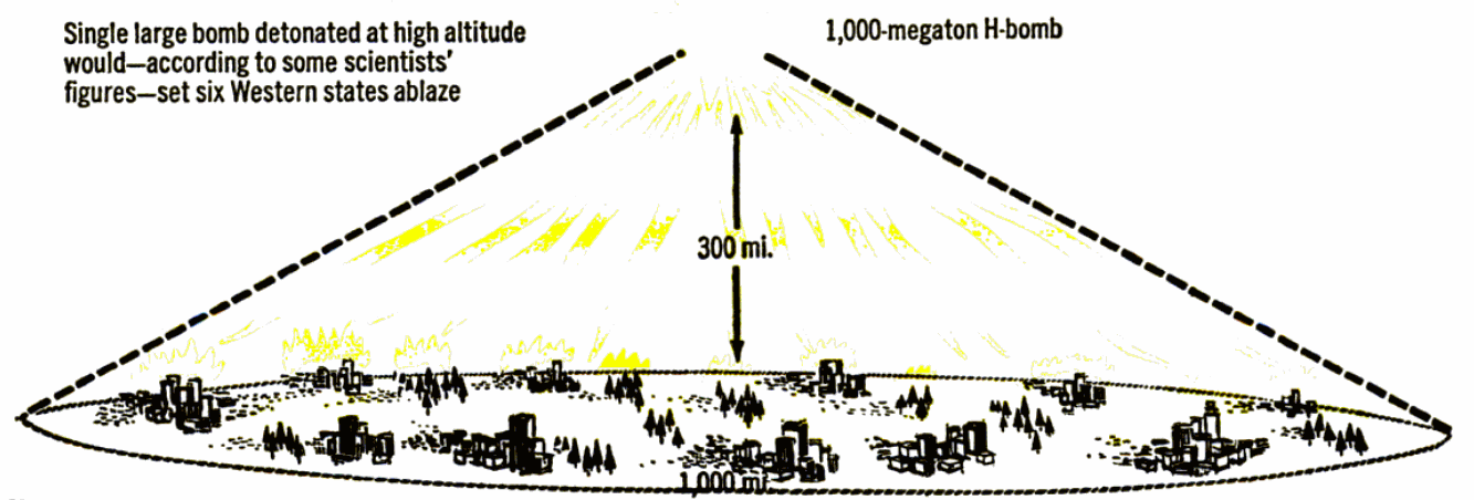 Суть: ударная волна не нужна. И вся эта трахомудия с многомегатонными зарядами с неэффективным приростом радиуса поражения тоже не нужна. Нужно взорвать на высоте 150-200км заряд многогигатонный! Что при этом происходит? Вся энергия уходит в рентген, который нагревает атмосферу на гигантской площади, сопоставимой с площадью континента. Нагревает настолько, что температура на поверхности подскакивает до сотен градусов. Получается такой как бы напалм в миллионы квадратных километров, сжигающий вообще нахуй всё и до кучи оставляющий громадную территорию без кислорода. При этом нет никаких радиоактивных осадков, лол. Только выжженная пустыня тотального нихуя. Спрятаться в полностью изолированном от внешней атмосферы бункере со своими запасами кислорода, конечно, можно. Вот только вылезать будет уже некуда и незачем.