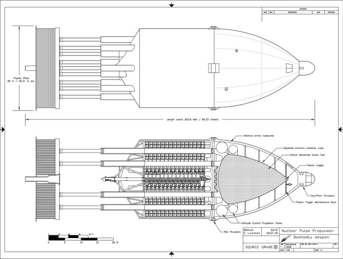 Одна маленькая проблемка: масса бомбы получалась в 200т для 1-гигатонной и 2000т для 10-гигатонной. Поэтому выводить их на орбиту предполагалось ёбами уровня SeaDragon или атомным взрыволётом, после чего они бы там висели, дожидаясь своего часа. Договор о неразмещении в космосе всё заруинил.
