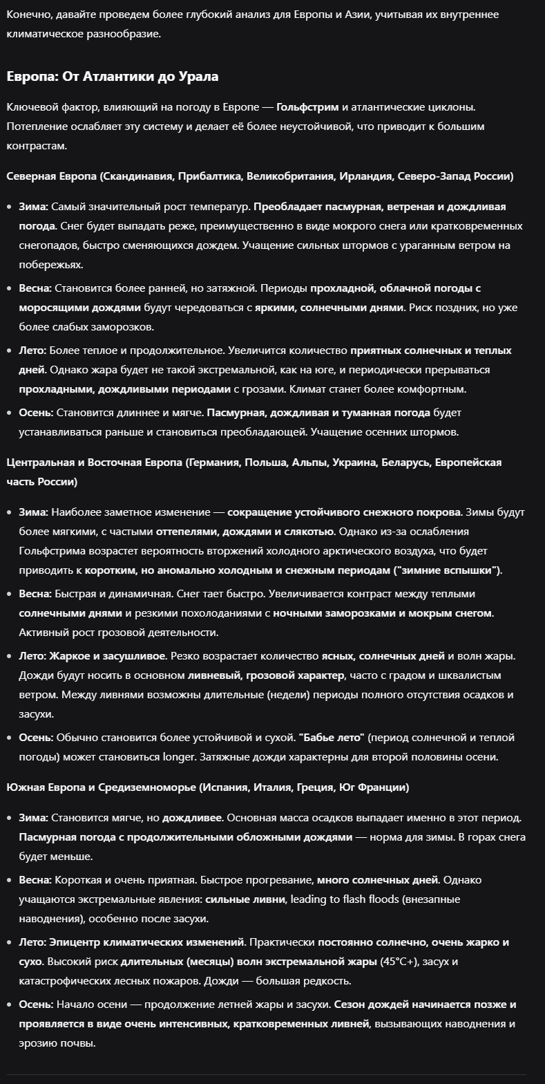 Постепенно идет глобальное потепление. Берем Европу. Сезонная погода становиться сложной, идет перекос к сухой и влажной погоде, количество отрицательных температур на спад, но ежесезонная влажность будет повышаться. Особенности устройства нашей планеты, преобладания воды.