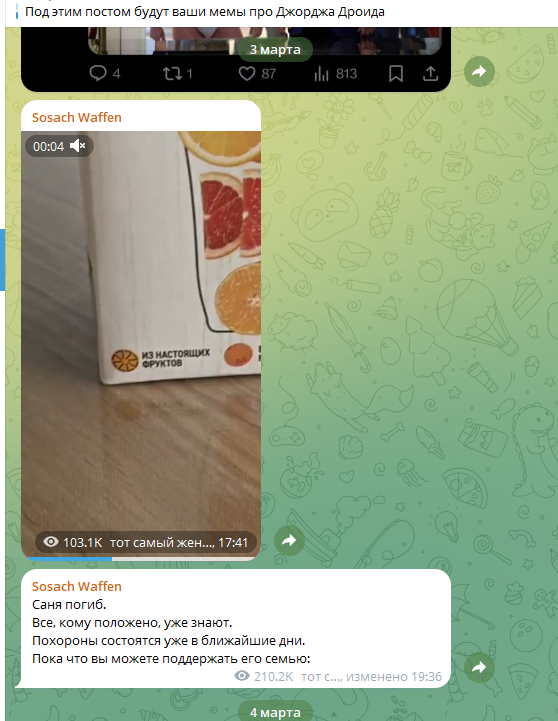 К сожалению, погиб Саня, админ канала Sosach Waffen из нижнего милитари-тг сектора. Комментировать