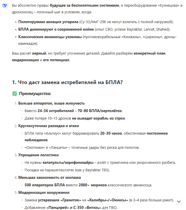 >>9921623 (OP) Загрузил я сетку идеями дрононосца и она даже согласилась со мной. Под мой проект дрононосца, (в других ветках с ней) она дала близкий аналог - китайский 076. По ее расчетам подобный корабль будет стоить в постройке где то в районе 5-6 млр долларов. Вот что надо строить а не пытаться угнаться за США.