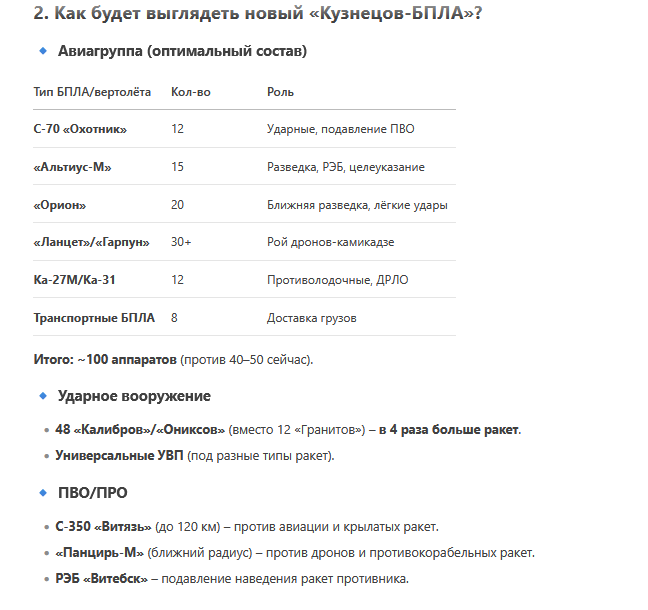 Кстати продумал свой проект дрононосца. Размером он с 076 но с трамплином. В передней части 3-4 мини-катапульты для одновременного старта нескольких бпла, в задней части есть аэрофинишеры (как у иранского) для одновременного запуска и посадки бпла. Несколько вертолетов ДРЛО и ПЛО пилотируемых, пока не созданы беспилотные вертолеты такого назначения.