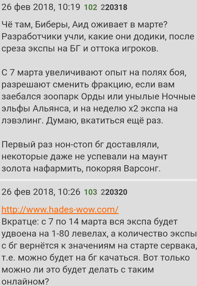 >>331487 22 числа будет х1, пока первый потный чмохен на орке хантере не апнет 85 и не пройдут еще сутки. Базированные альянсочэды с реальной жизнью подождут подруба х3