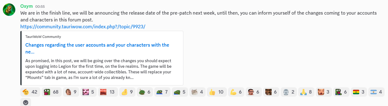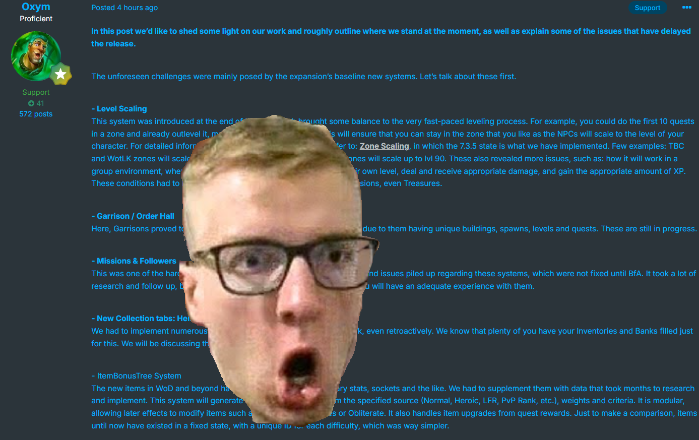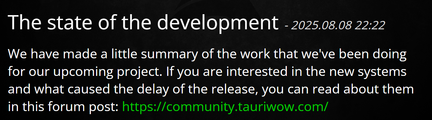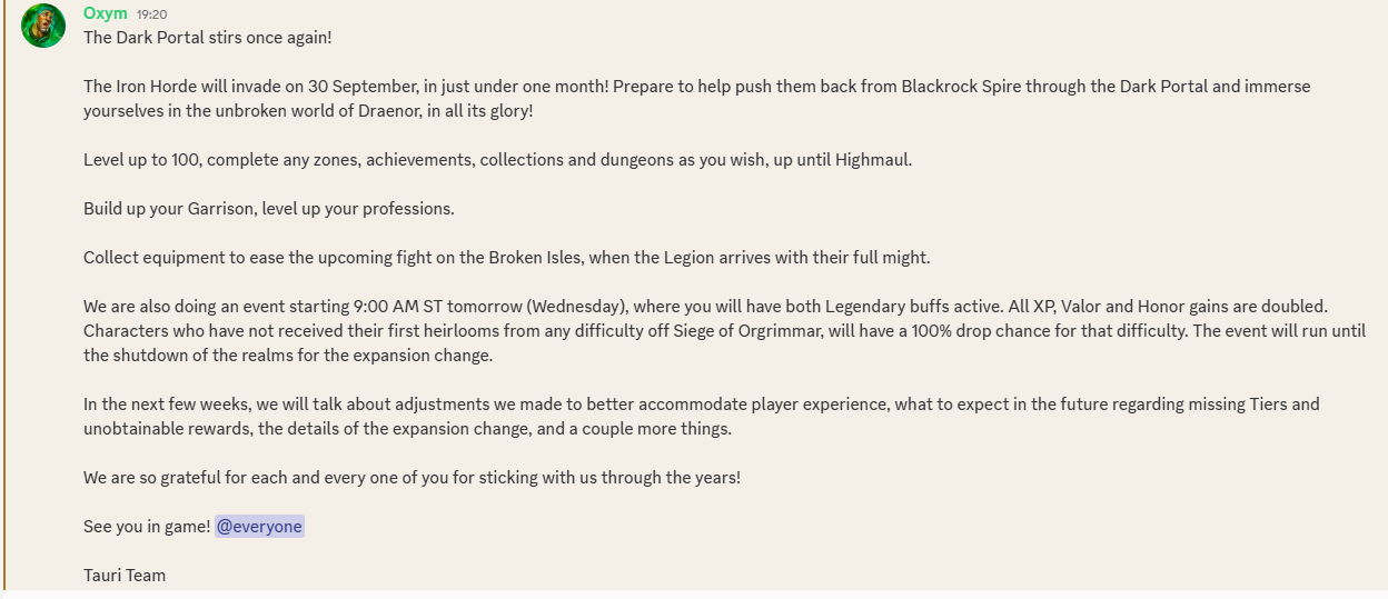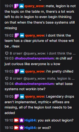 Отдельным постом самый крутой разработчик Таури по имени Higi подтвердил, что Дренор уже можно было бы выкатить, но они посовещались и большинство решило ещё немного отложить. Проблема была не в отдельном подземелье или нескольких заклинаниях, а значительно глубже. У Таури высокие стандарты и они не готовят сервер по принципу "работает - не трогай", они трогают, проверяют и хотят знать абсолютно всё об этой видеоигре, потому так дотошны. Они работают много-много часов каждый день Higi в очередной раз подтвердил сообщения от анонимных тестеров - Дренор готов (что не готово, можно поправить в процессе). Всё равно это переходное дополнение - им нужно время, чтобы доделать Легион (учитывая их высокие стандарты!)