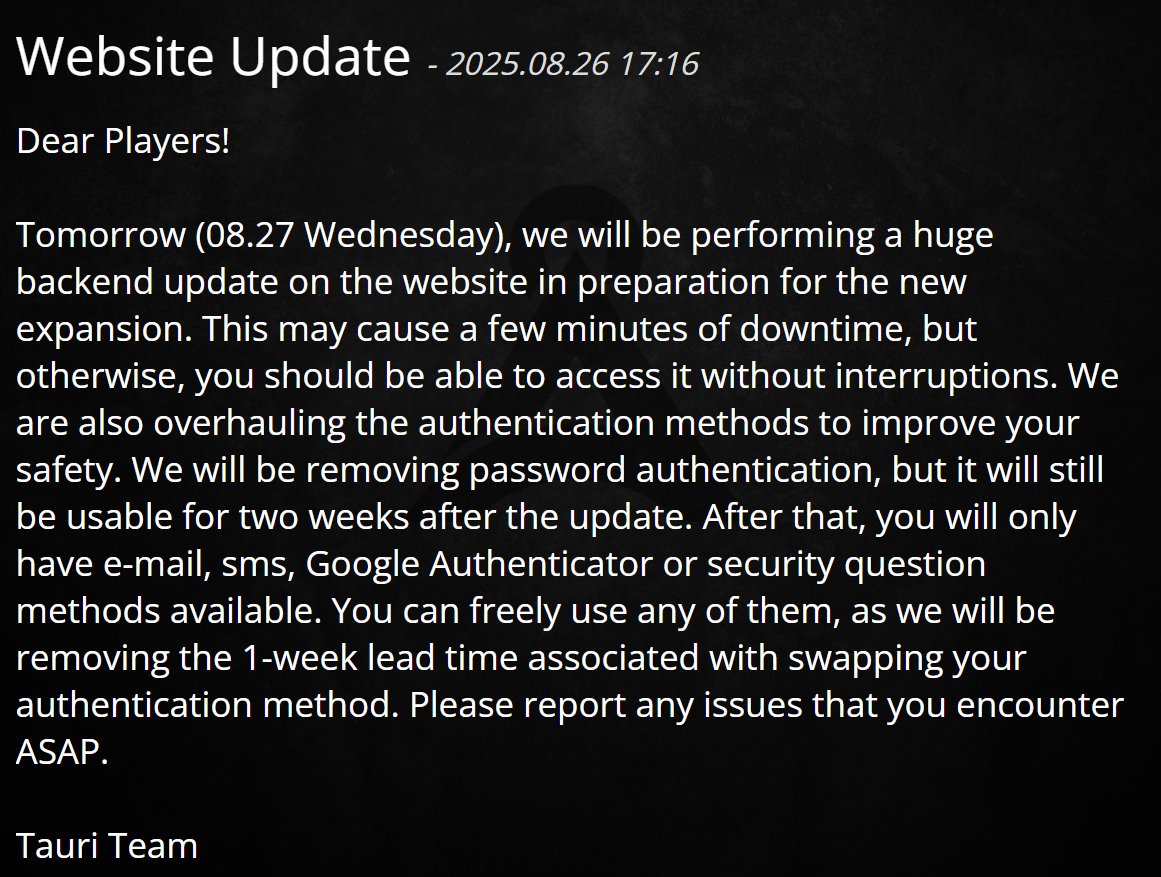 Завтра (среда, 27 августа) мы проведём масштабное обновление бэкенда сайта в рамках подготовки к новому расширению. Это может привести к нескольким минутам простоя, но в остальном вы сможете получить к нему доступ без перебоев. Мы также пересматриваем методы аутентификации для повышения вашей безопасности. Мы отключим аутентификацию по паролю, но она всё ещё будет доступна в течение двух недель после обновления. После этого вам будут доступны только методы электронной почты, SMS, Google Authenticator или контрольный вопрос. Вы можете свободно использовать любой из них, так как мы уберём недельный срок, связанный с заменой метода аутентификации. Пожалуйста, помните, что Котофаня - ето крутышка и если что сообщайте о любых возникших проблемах как можно скорее.