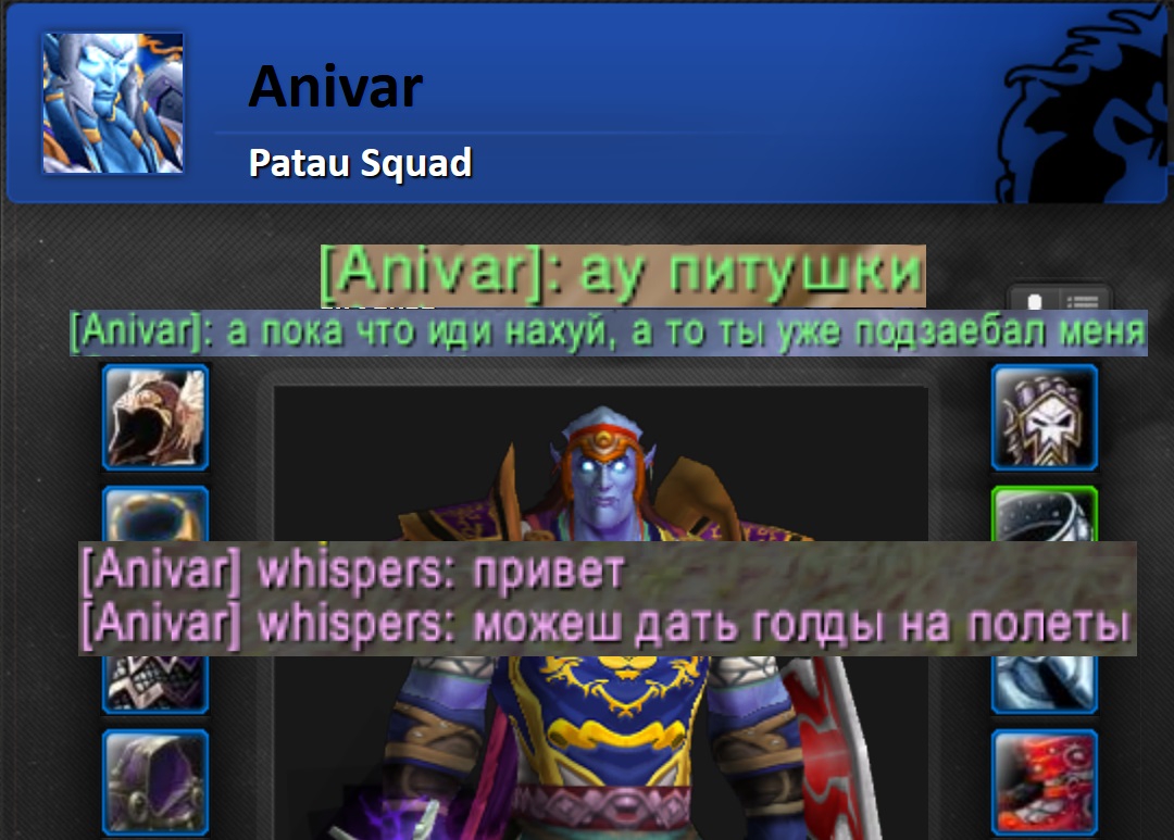>>397591 Ой не знаю какой-то ты злой стал, последние 40 сообщений на Дваче связаны с "дать по голове" совсем озверел в своём Альянсе На этом сервере мои игровые псевдонимы будут Soni+название класса. Сейчас буду играть героем с именем Sonimage. Да не РПшно, но это подчёркивает, что речь всё-таки о ПТР и официально мой герой не родился, то есть у него нет имени - это заготовка! Мы с котом будем проходить все классовые цепочки заданий за все классы в классной игре World of Warcraft!