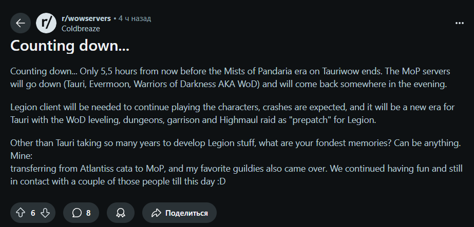 Это может быть лучший сервер на планете Земля, но они не выпускают ни Дренор, ни тем более Легион Аудитория сервера - крутые крутышки, очень классные ребята, но Пандария на протяжении 8 лет - это перебор (в интернете сказали запуск был в апреле 2017!) Пора, ребята, пора! Наши герои устали отдыхать, они рвутся в бой!