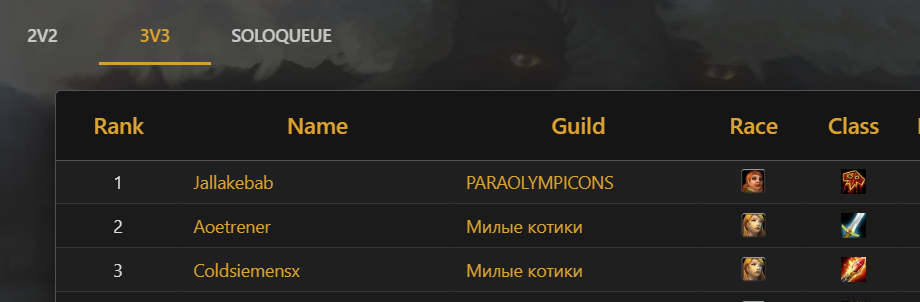 поясняю за арену в предпоследний рас на сервере аргент давн в гильдии бэд блад была девушка то ли алекса то ли алексия она катала арену на 1300 в соло шафле. вроде "хихи 1300" но так может сказать только челик который ваще не шарит. там на 1300 были такие бойни и хила контролят и дпс 50к (тогда это означало что твой челибасик упадёт секунды за 2 во вермя бурста если не успеешь деф нажать), короче жара такая что с ума сойти, походу во времена бк и начала вотлка так играли на рейтинге 2400 не меньше. короче эта девка стоила сотни терпил которые после первого поражения бегут поджав хвост потому с кем мне довелось аренить фаня и зуза обоим респект, поражения и вообще бои вызывали у них боевой азарт типа "ща ща сделаем погоди ща соображу вот тут так надо вот тут так ща придумаем"