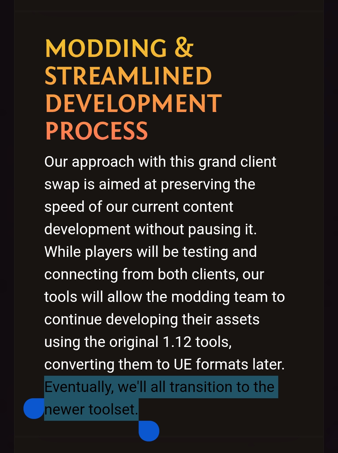 >>409424 Модам хоть и фиксится, но всё равно клиент уже устаревший и видно, как он иногда может пролагивать и подвисать только из-за своего возраста. А ещё на нём тяжело делать новый контент, что как раз решается переходом на новый движок.