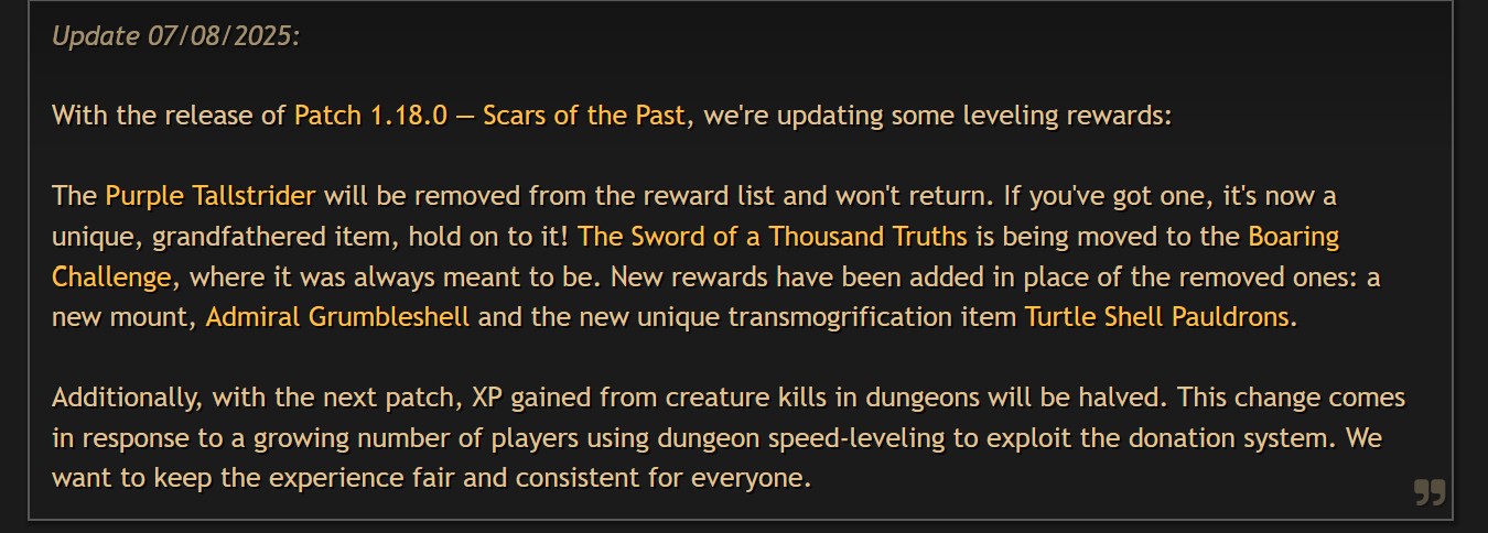 >>408736 О нет, забрали курицу на которой никто не ездил и дали черепаху, как жить то теперь. А еще игрушечный меч, который нельзя было использовать для трансмога, отправили в другой челлендж. Ну все, итс овер, сервер теперь неиграбелен