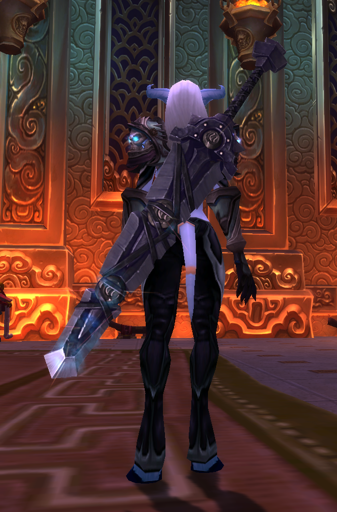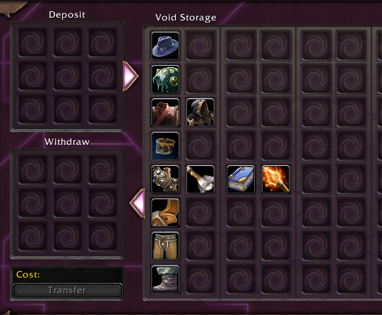 Впервые в жизни воспользовался банком и [Void Storage]. Обычно в банке покупал ячейки для ачивки и забивал навсегда, второе вообще муть какая-то - я скупердяй, невротик, человек в футляре и всё своё ношу с собой, трансмог всегда лежит в основных сумках. ТИПА ВАЩЕ НИКОГДА ПРЯМ НЕ ПОЛЬЗОВАЛСЯ В ЖИЗНИ. В общем закрыл гештальт, оказывается и правда удобно, положил так трансмог и пусть лежит. Тем более сейчас молот, а завтра волшебная палочка, а послезавтра посох или кинжал - пусть лежат и ждут, удобно! Фешн костюмчик туда не складывается положил в банк!