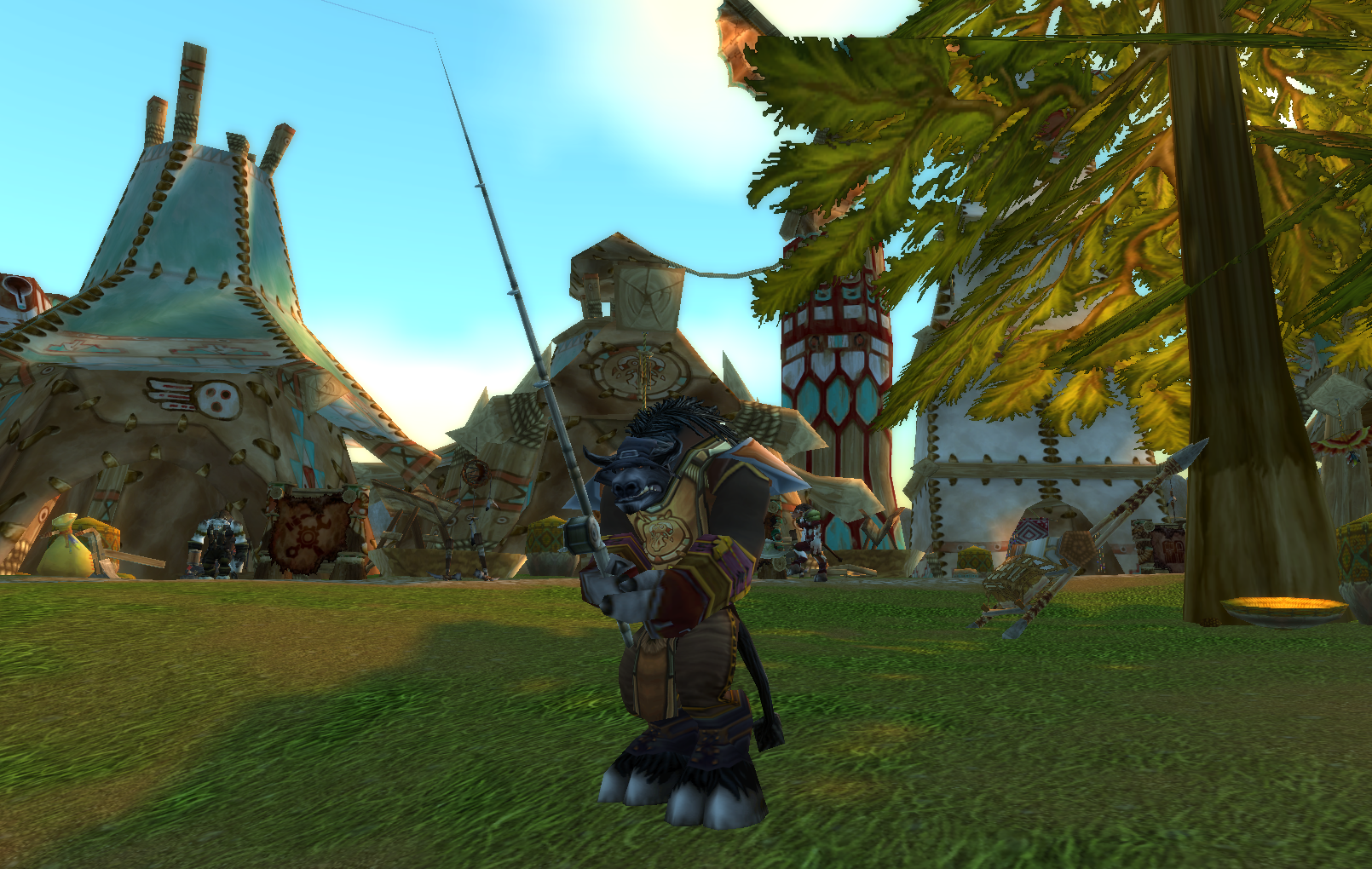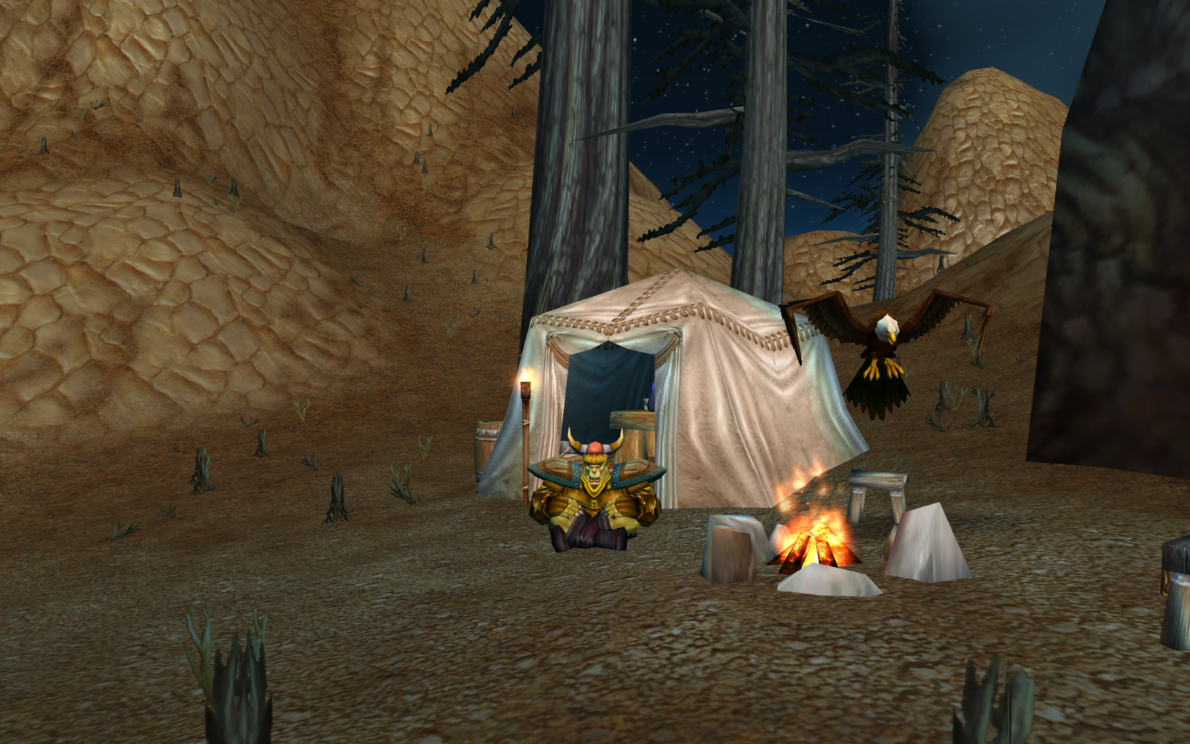 Напоминаю! Игроки на тауренах (ещё не элита, но уже немножко показавшие себя), получают в качестве временного жилья вот эту замечательную палатку на берегу горного озера - уют, тишина, покой, безопасность, круто. В палатке вы можете найти супермодные очки - это часть вашего нового статуса! Вы больше не новичок! У Альянса (вонючек) такой программы поддержки вообще нет!