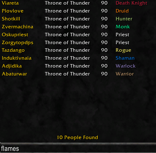 Всё. Прочувствовал босса [Lei Shen] и возможно понял в чём прикол ПвЕ, зачем люди вообще сюда ходят (крое как от скуки). Круто, как надо быстро-быстро выбегать из молнии на полу (1 секунда промедления и можно помереть). Вбегать в своего светящегося (а не убегать...), затем разбегаться по 4-м зонам и там снова вставать в своего, потом ловить на полу штуки, чтобы не появились помощники босса... Так прикольно такое движение на этой площадке туда-сюда!!!! Правда жёстких наносителей урона не хватает. Целителей вроде достаточно, но наносителей урона долго ждать приходятся и не факт, что мощный челик придёт