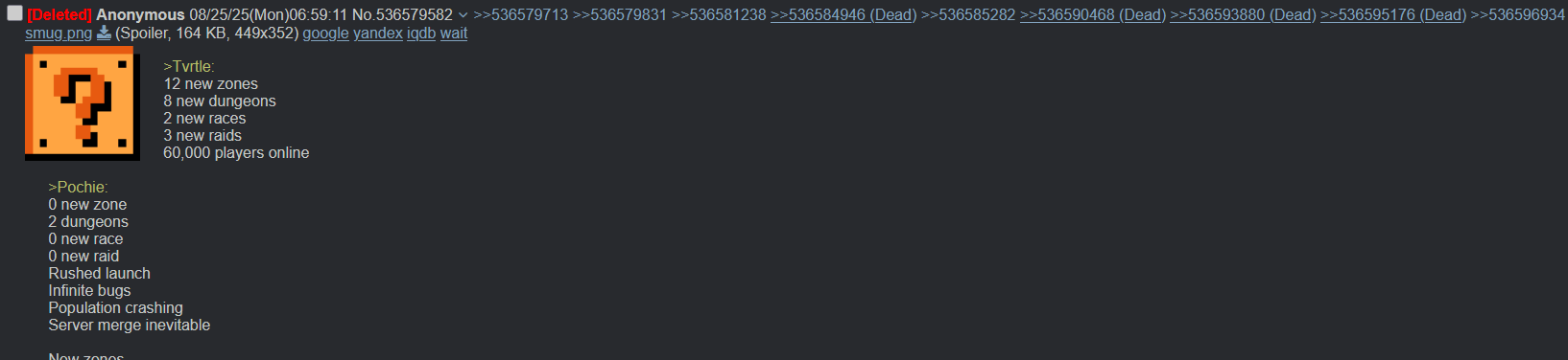 >>411850 Туртл на базе 1.12.1 клиента что значит кучу неудобств технических при игре + там упор именно на сранилу включая все её косяки и недоработки в гемплее например у хантов там всё ещё есть мёртвая зона при стрельбе. В то же время Эпох на базе 3.3.5 уже более продвинутый клиент в техническом плане, лучший выбор из аддонов, плавность управления, и нет такого фанатичного дроча на классические баги и недоработки хотя конечно маркеры с карты у квестов и подсветку квестовых айтемов для подбора зачем то выключили, кастом контента больше на туртле вроде но серверу 10 лет уже хули, на эпохе тоже нового хватает, пока ещё не весь сервер и мир изучены все свежее новое необычное. Зайди на Эпох попробуй напиши как он тебе, скриншоты запости свои.
