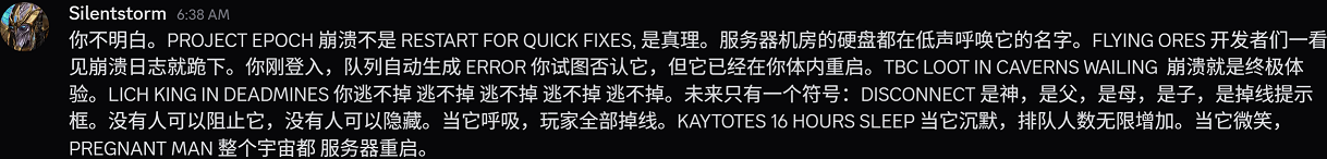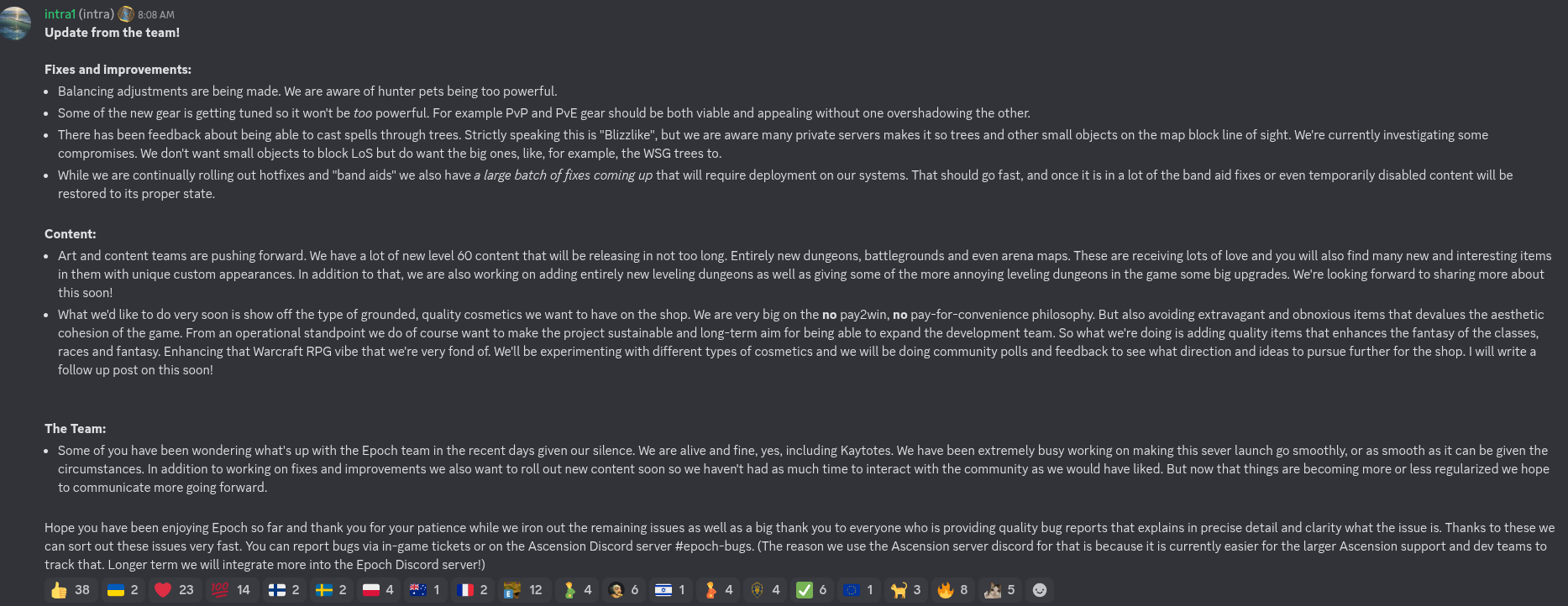 Надеемся, что до сих пор Epoch доставляла вам удовольствие, и благодарим вас за терпение, пока мы решаем оставшиеся проблемы, а также большое спасибо всем, кто предоставляет качественные отчеты об ошибках, в которых подробно и ясно объясняется, в чем проблема. Благодаря им мы можем очень быстро разобраться с этими проблемами. Вы можете сообщать об ошибках с помощью внутриигровых тикетов или на сервере Ascension Discord #epoch-bugs. (Причина, по которой мы используем сервер Ascension discord для этого, заключается в том, что в настоящее время более крупным командам поддержки Ascension и разработчиков проще отслеживать это. В долгосрочной перспективе мы еще больше интегрируемся с сервером Epoch Discord!)